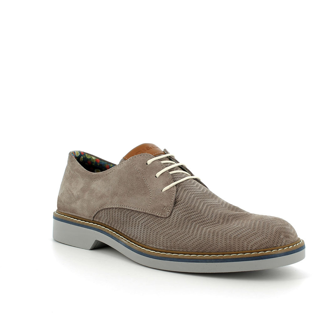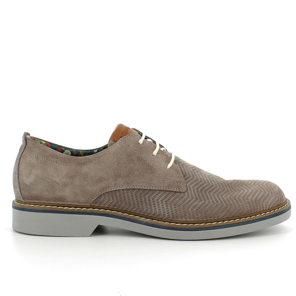 AN OXFORD-STYLE DERBY MADE OF SUEDE, WITH LACES AND SOLE IN CONTRASTING COLORS, FOR A YOUNG AND DYNAMIC LOOK. BEING PRACTICAL AND VERSATILE, THEY ARE SUITABLE FOR EVERY OCCASION. THE PATTERN-PRINT TEXTILE LINING MAKES THESE SHOES MORE ORIGINAL. THE LEATHER INSOLE ENSURES COMFORT AND HYGIENE.