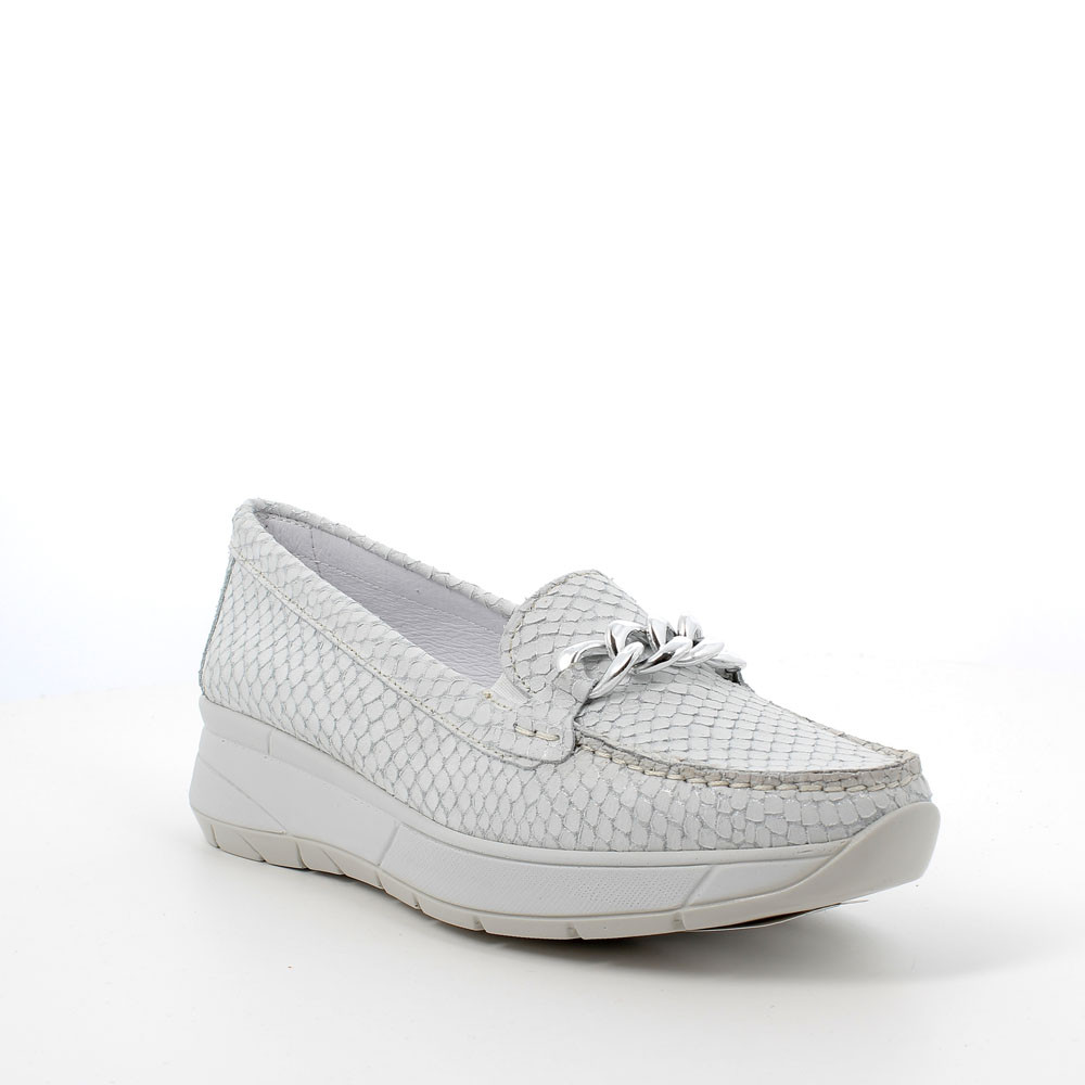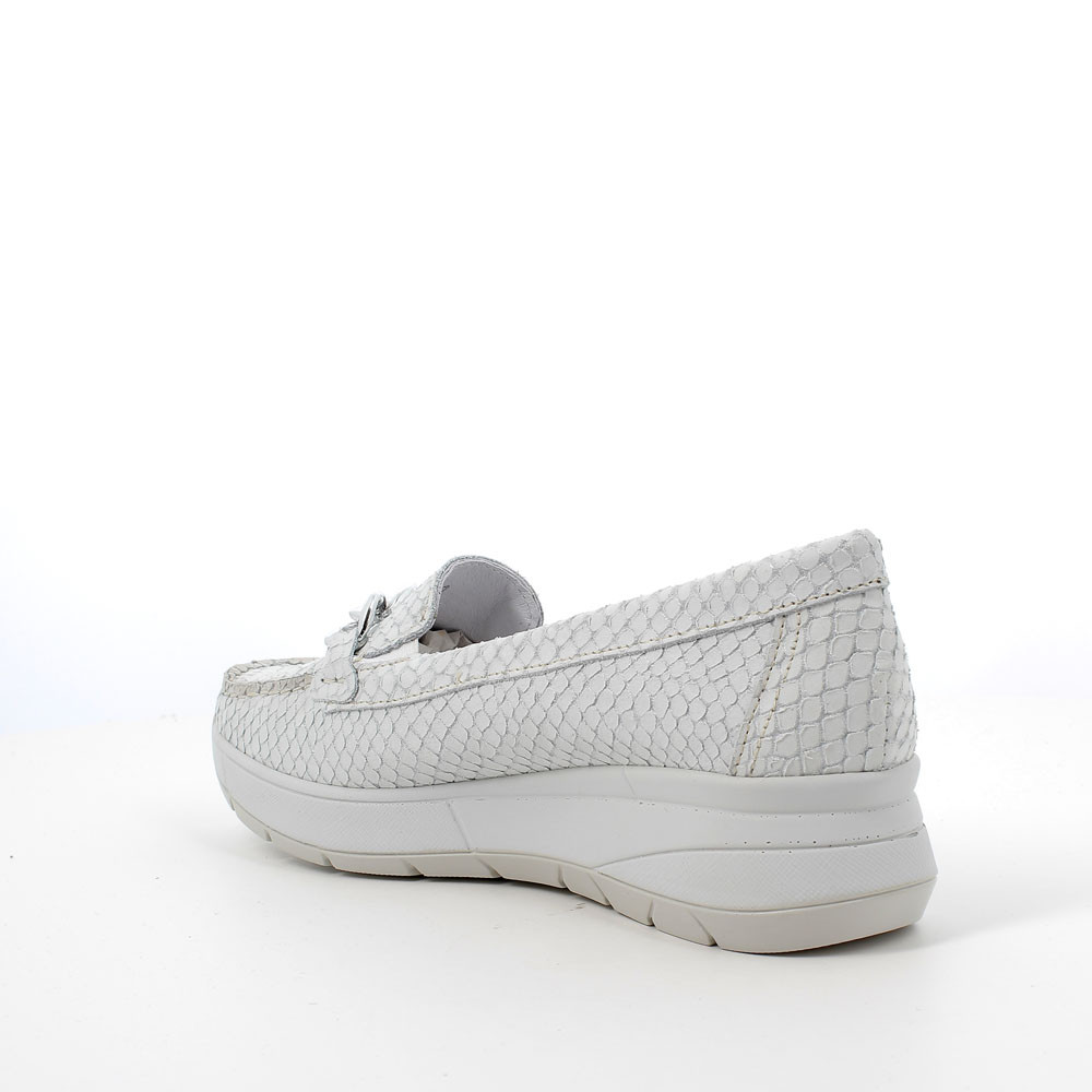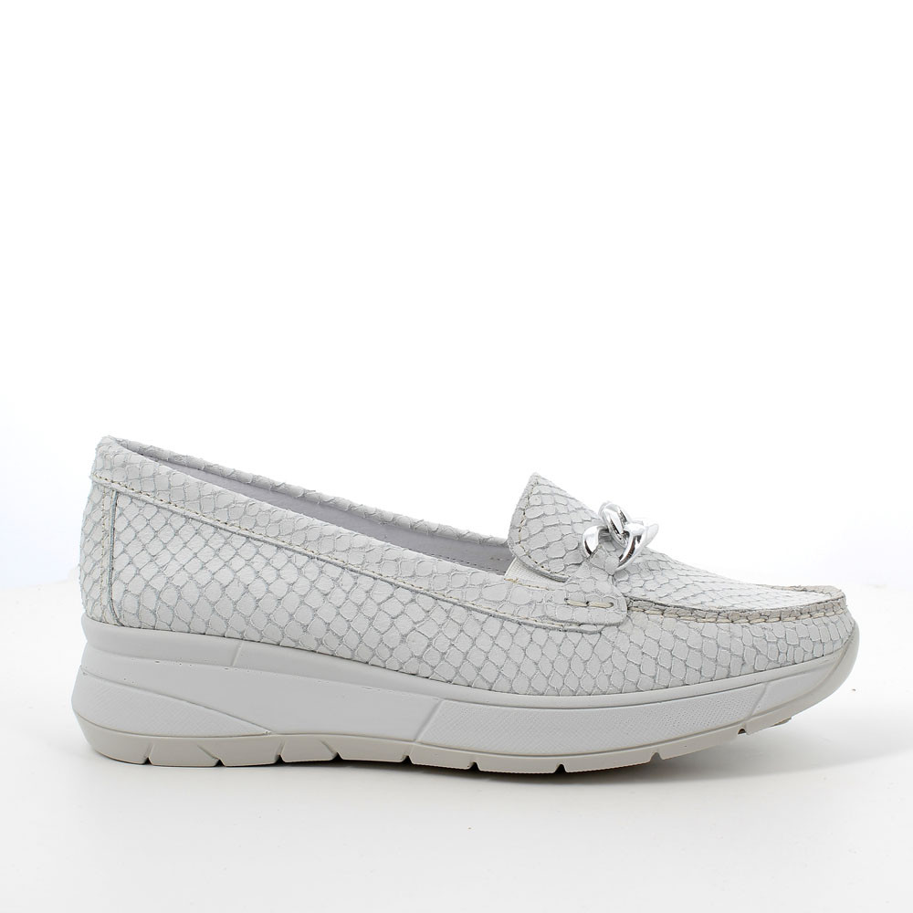 A REPTILE-PRINT MOCCASIN WITH A DELICATE LAMINATED-EFFECT. IT IS EASY TO MATCH WITH THE MOST ELEGANT AND DYNAMIC LOOKS AND IT HAS A METALLIC DECORATIVE ACCESSORY IN LINE WITH THE LATEST FASHION TRENDS AND ALSO ELASTIC INSERTS THAT FACILITATE THE FITTING. THE COMFORT IS GUARANTEED ALSO BY THE ANATOMIC LEATHER INSOLE.