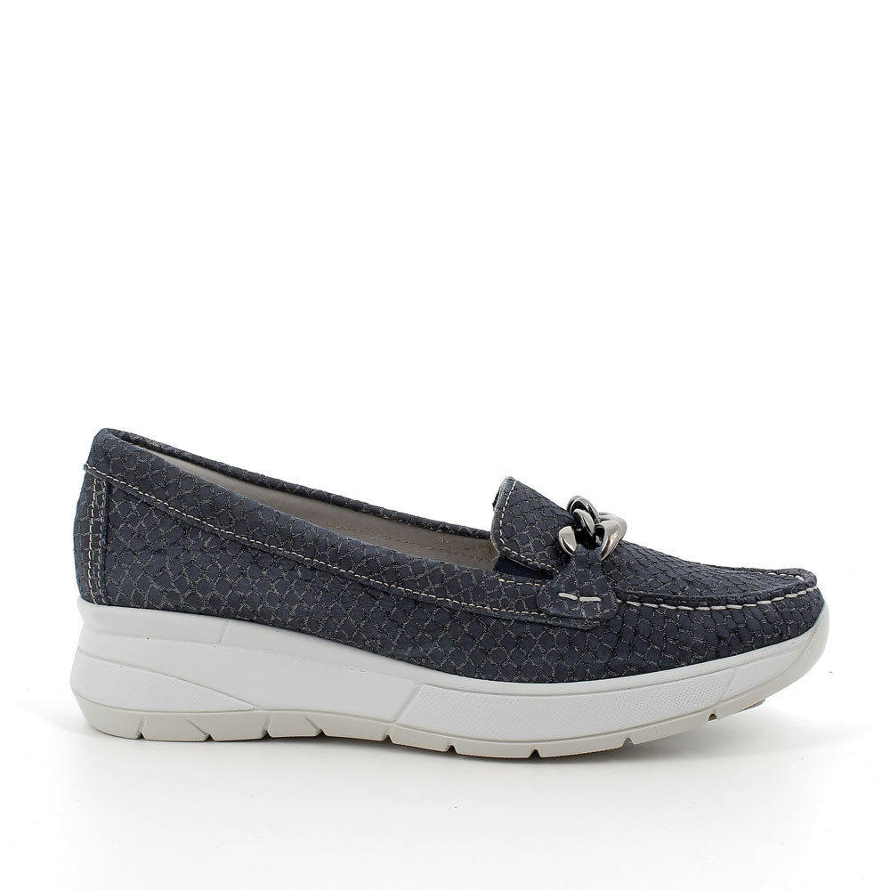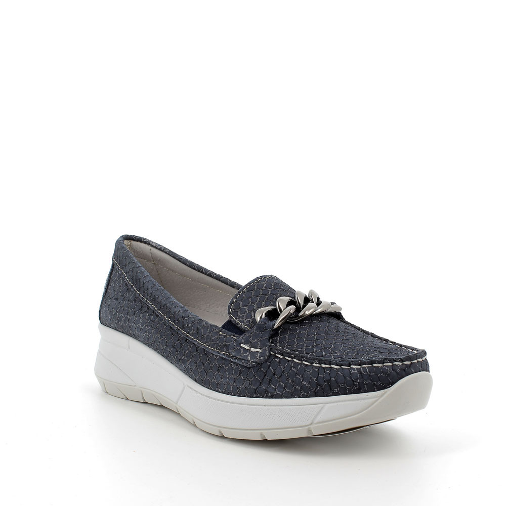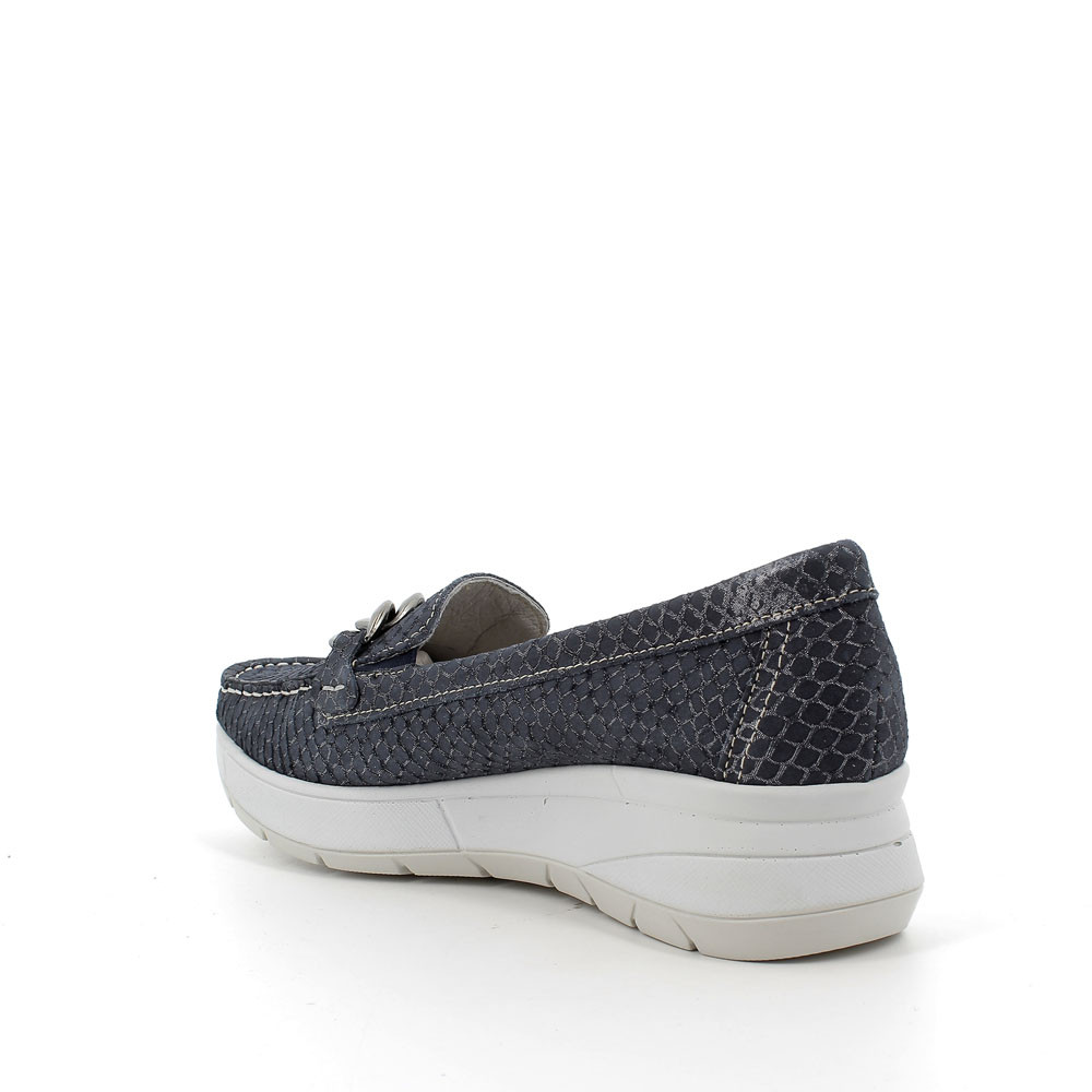 A REPTILE-PRINT MOCCASIN WITH A DELICATE LAMINATED-EFFECT. IT IS EASY TO MATCH WITH THE MOST ELEGANT AND DYNAMIC LOOKS AND IT HAS A METALLIC DECORATIVE ACCESSORY IN LINE WITH THE LATEST FASHION TRENDS AND ALSO ELASTIC INSERTS THAT FACILITATE THE FITTING. THE COMFORT IS GUARANTEED ALSO BY THE ANATOMIC LEATHER INSOLE.