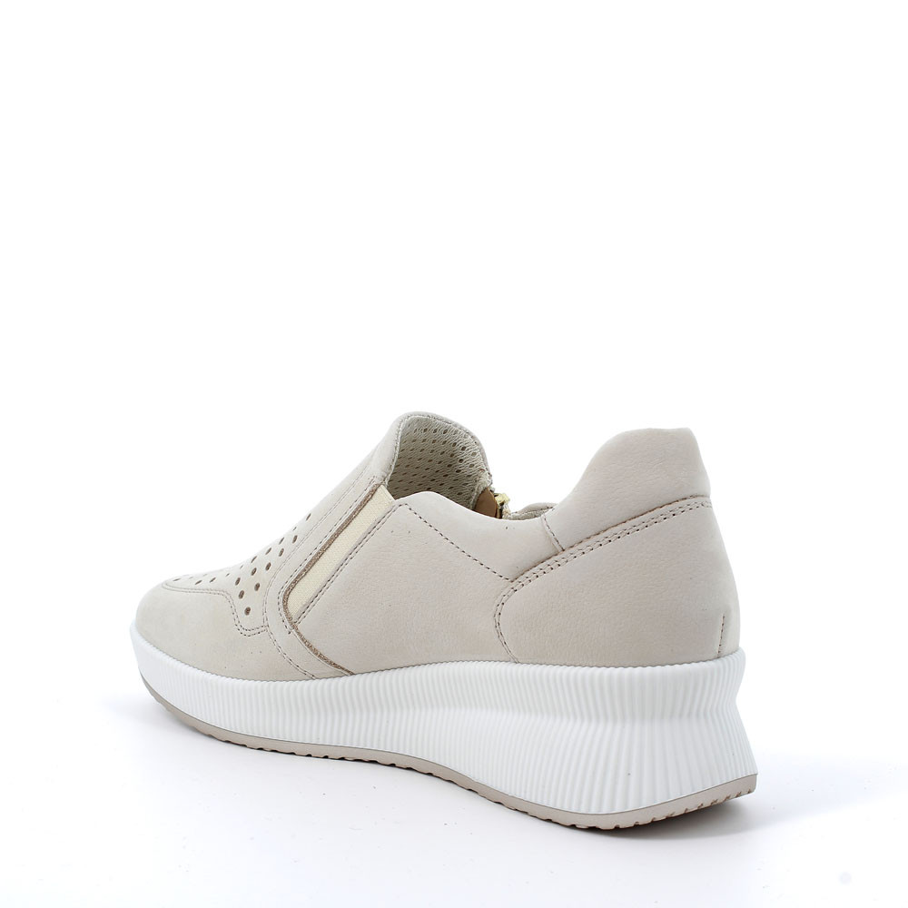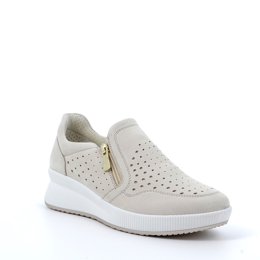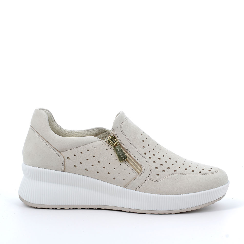 A DYNAMIC AND CONTEMPORARY LOOKING SHOE MADE OF SOFT PERFORATED LEATHER AND TEXTILE LINING, FOR A HIGHER FRESHNESS. IT IS EASY AND QUICK TO WEAR THANKS TO THE SIDE ZIPPER AND TO THE INTERNAL ELASTIC. THE MODERN WEDGE SOLE OFFERS GREAT SUPPORT AND IT IS ALSO EXTREMELY LIGHT. THE REMOVABLE MEMORY FOAM INSOLE GUARANTEES COMFORT AND CUSHIONING.