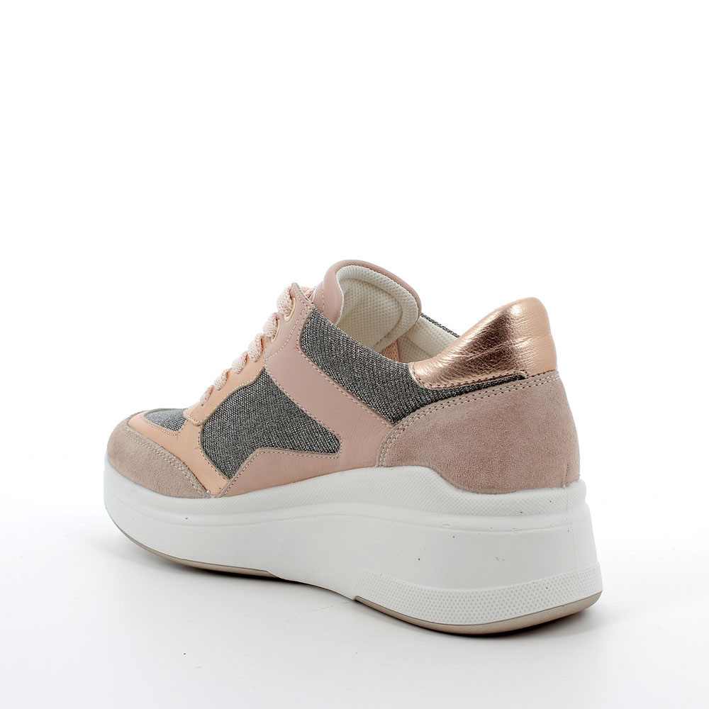 AN EYE-CATCHING AND CONTEMPORARY SNEAKER MADE OF LEATHER AND GLITTER TEXTILE. THE LACES ALLOW A PERFECT ADJUSTMENT AND THE WEDGE SOLE OFFERS SUPPORT AND PROTECTION FROM THE IRREGULARITIES OF THE GROUND. THE REMOVABLE LEATHER INSOLE IS PRACTICAL AND HYGIENIC AND ENSURES COMFORT AND AN ENDURING DRY FEELING.