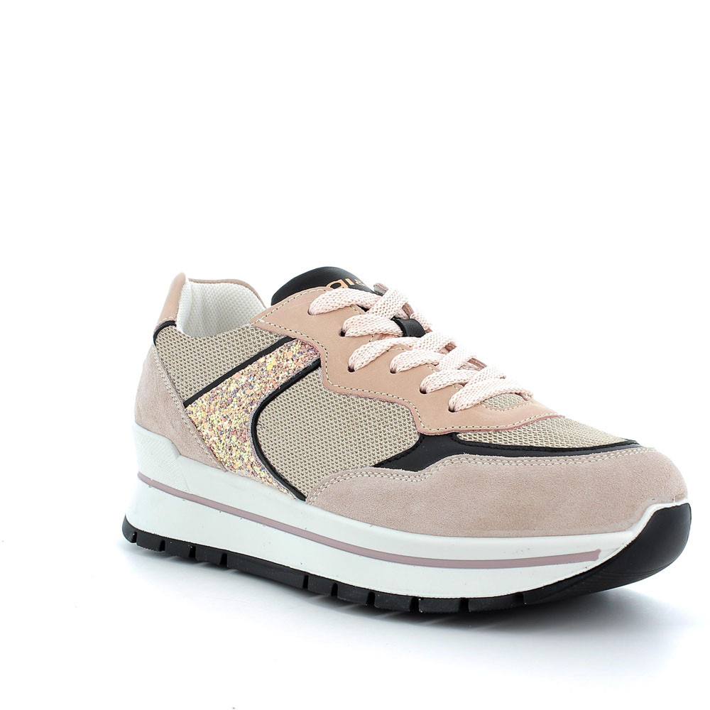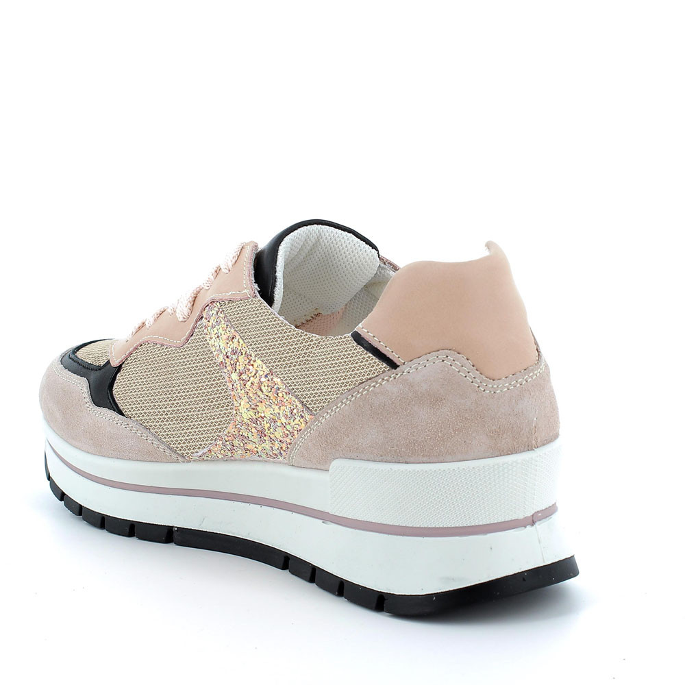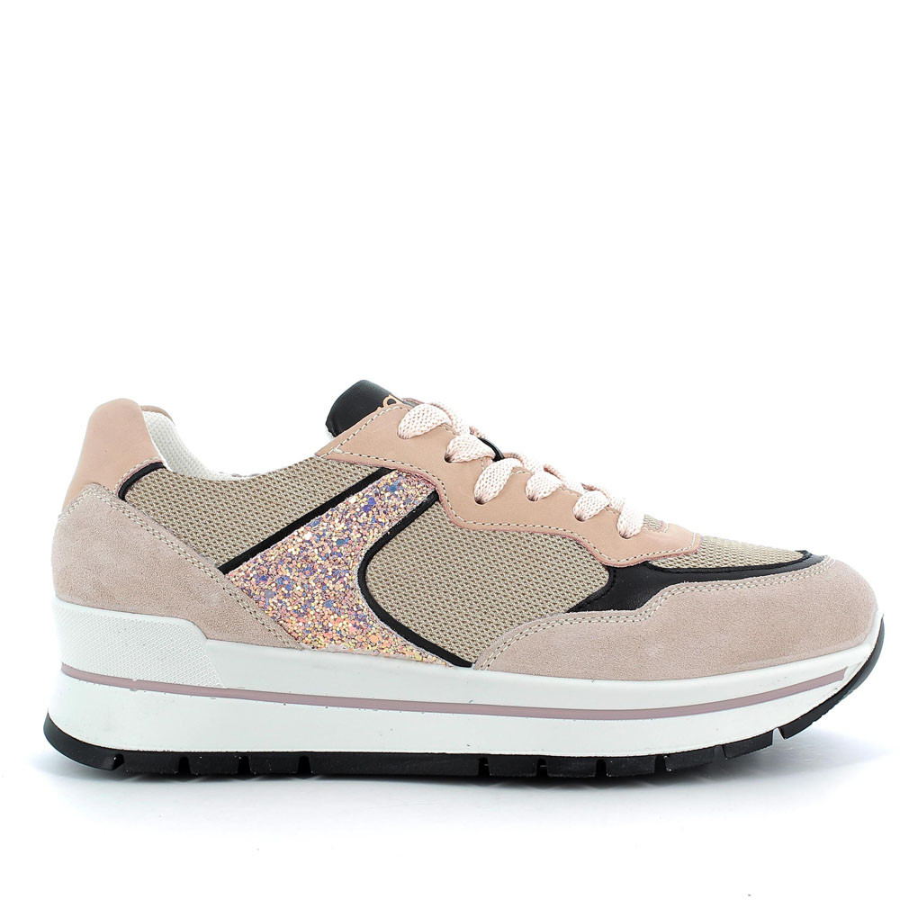 A SPORT-LOOKING SNEAKER WITH TRENDY DETAILS. THE UPPER IS MADE OF TECHNICAL TEXTILE AND LEATHER, COMBINING QUALITY AND COMFORT. THE PLATFORM SOLE OFFERS STABILITY AND LIGHTNESS, WHILE THE INSOLE WITH MEMORY FOAM ENSURES FOOT'S WELL-BEING