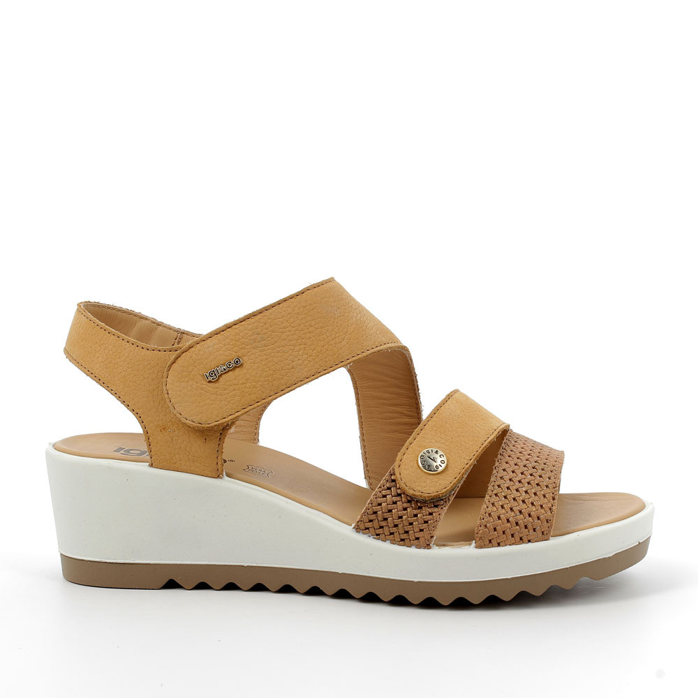 AN EVERGREEN SANDAL MADE OF SOFT LEATHER WITH BRAIDING-EFFECT DETAILS. IT IS EASY TO ADJUST THANKS TO THE DOUBLE VELCRO AND TO THE INTERNAL ELASTIC, FITTING EVERY FOOT TYPE. THE LIGHT WEDGE SOLE SLIMS THE FIGURE AND GRANTS AN ALL DAY COMFORT.