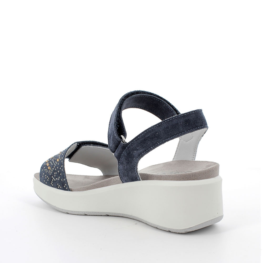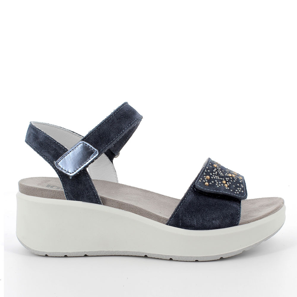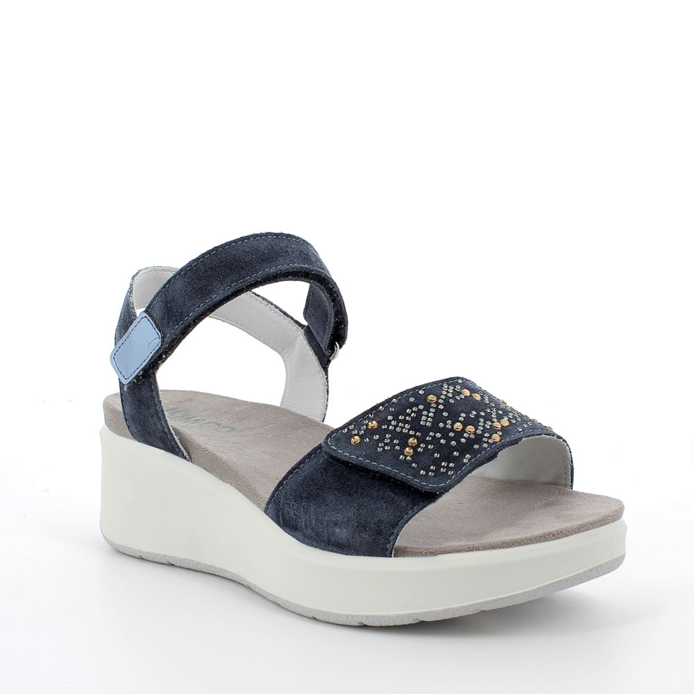 A SOFT SUEDE LEATHER SANDAL WITH AN ADJUSTABLE FRONT BAND EMBELLISHED WITH RHINESTONES. IT IS EASY TO ADJUST THANKS TO THE VELCRO AT THE ANKLE. THE MEDIUM-HEIGHT WEDGE SOLE SLIMS THE FIGURE AND IT IS ALSO COMFORTABLE AND LIGHT.