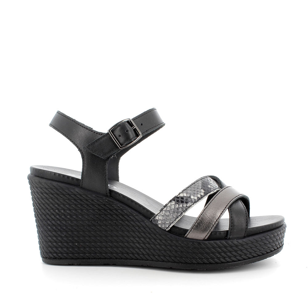 A VERSATILE AND VERY COMFORTABLE SANDAL MADE OF A MIX OF HIGH-QUALITY LEATHERS. THE CROSSED FRONT BANDS GIVE IT A FEMININE LOOK, AND IT HAS A SINGLE BUCKLE AT THE ANKLE FOR A QUICK FIT. THE ROPE-EFFECT WEDGE WITH THE FRONT PLATEAU IS EXTREMELY LIGHT, WHILE THE SOFT INSOLE OFFERS A GREAT COMFORT ALL DAY LONG.
