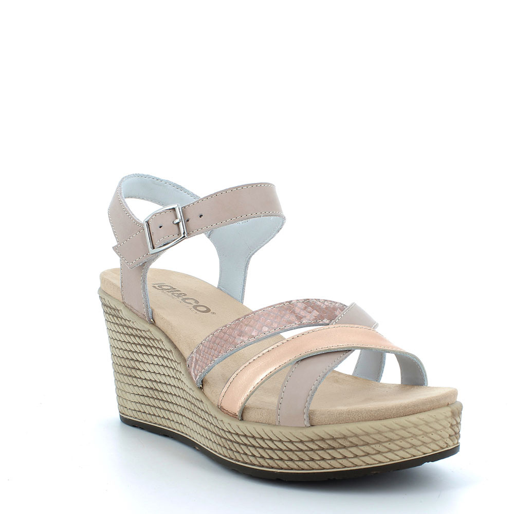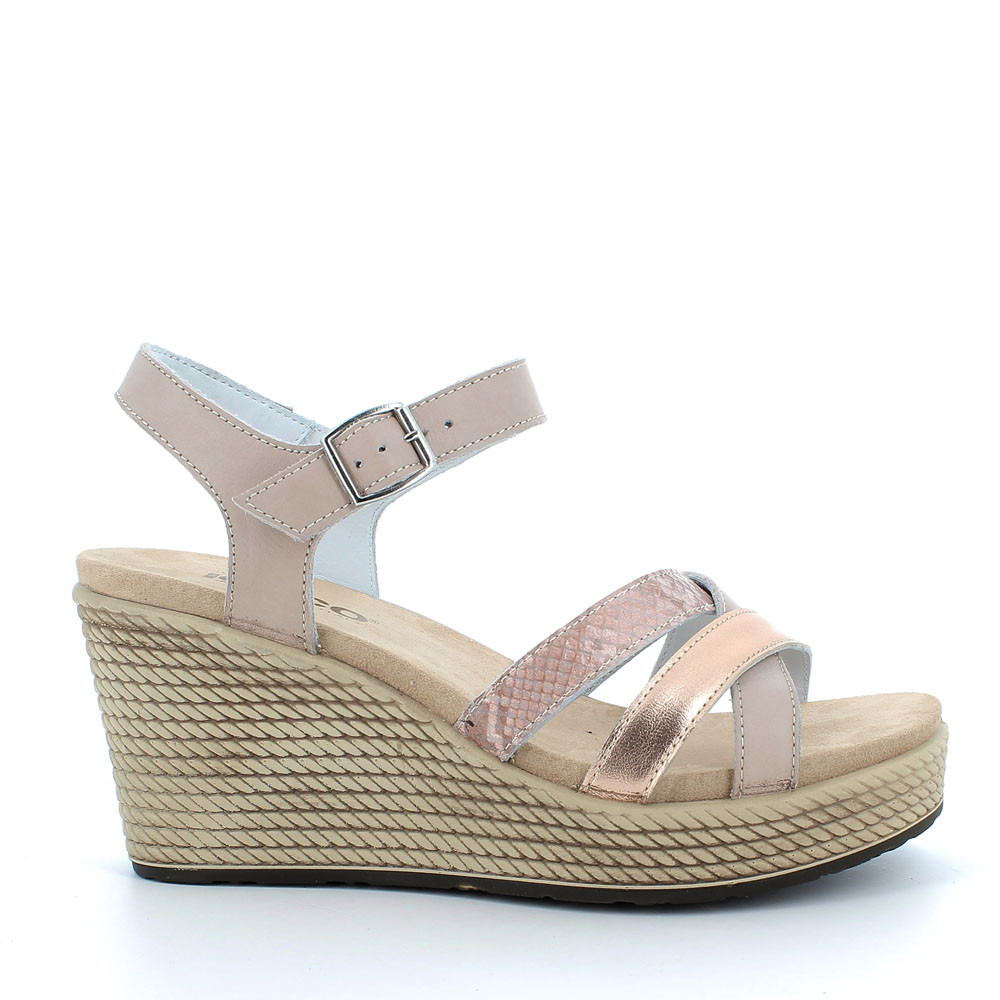 A VERSATILE AND VERY COMFORTABLE SANDAL MADE OF A MIX OF HIGH-QUALITY LEATHERS. THE CROSSED FRONT BANDS GIVE IT A FEMININE LOOK, AND IT HAS A SINGLE BUCKLE AT THE ANKLE FOR A QUICK FIT. THE ROPE-EFFECT WEDGE WITH THE FRONT PLATEAU IS EXTREMELY LIGHT, WHILE THE SOFT INSOLE OFFERS A GREAT COMFORT ALL DAY LONG.