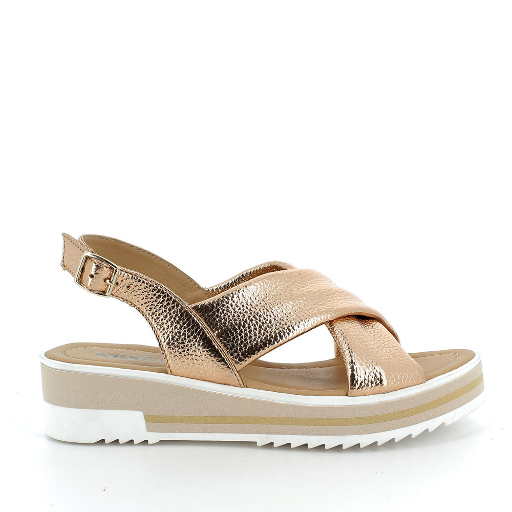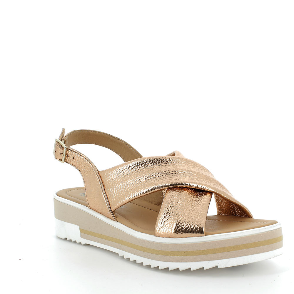 A SLINGBACK SANDAL WITH SOFT CROSSED FRONT BANDS. A VERY COMFORTABLE AND FEMININE STYLE, IT IS EASY TO ADJUST THANKS TO THE BUCKLE AT THE ANKLE. THE WOODEN-EFFECT SOLE GIVES IT A STRONG, SPORT-INSPIRED LOOK. THE LEATHER INSOLE OFFERS A SOFT SUPPORT AND BREATHABILITY.