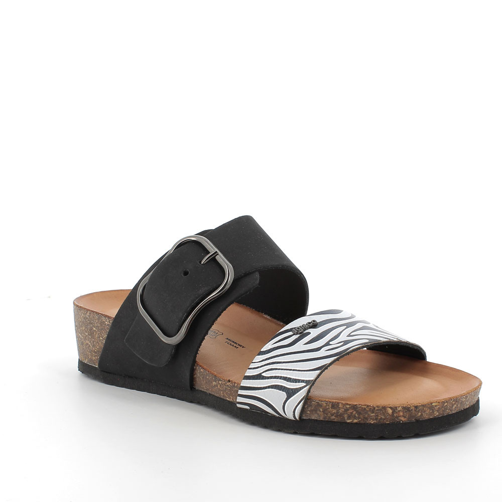 A SLIDE SANDAL WITH A DOUBLE BAND UPPER, WHOSE POSITIONING GRANTS A GREAT HOLD ON THE FOOT AND FREE MOVEMENTS. THE DECORATIVE BUCKLE IS USEFUL ALSO TO ADJUST THE SANDAL. THE SPECIFIC INSOLE, WITH MEMORY FOAM, ABSORBS AND PROTECTS THE FEET FROM IMPACTS, GIVING THEM COMFORT AND RELIEF.