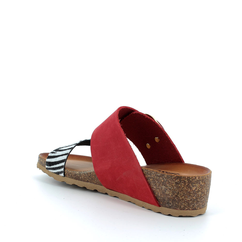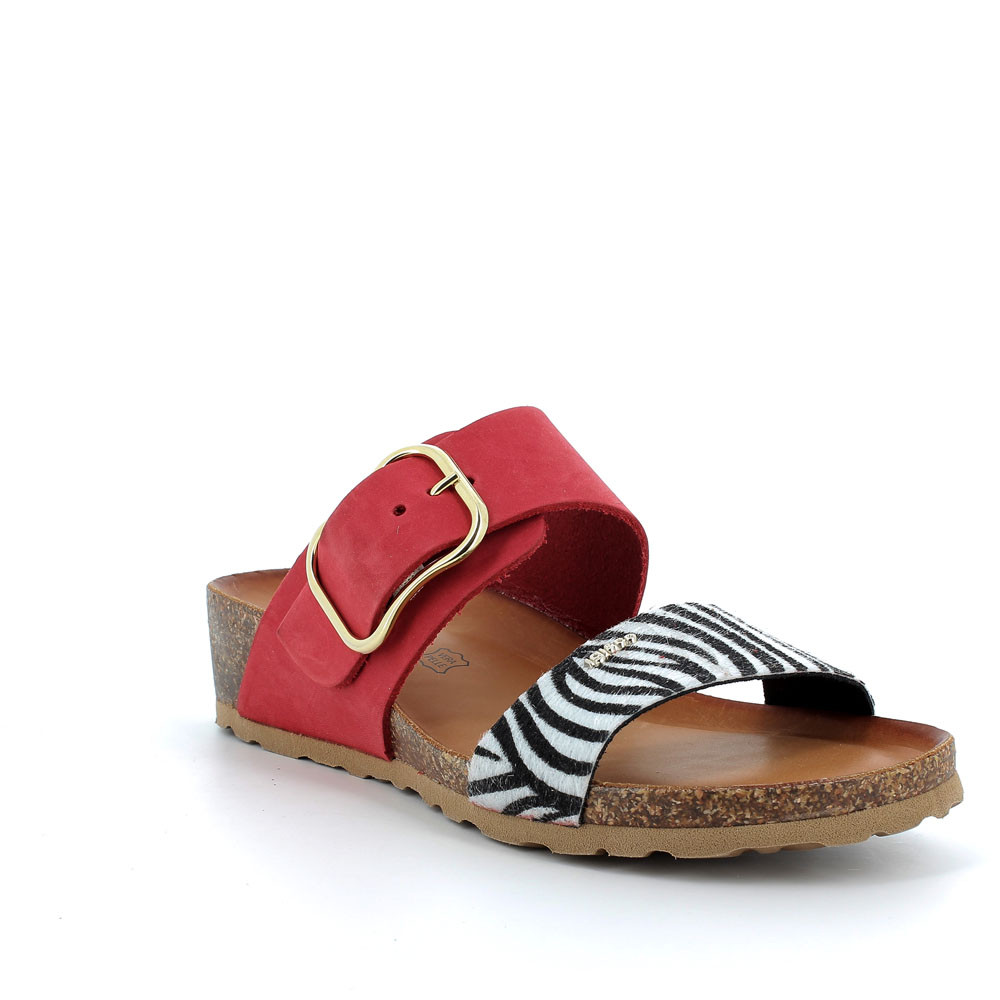A SLIDE SANDAL WITH A DOUBLE BAND UPPER, WHOSE POSITIONING GRANTS A GREAT HOLD ON THE FOOT AND FREE MOVEMENTS. THE DECORATIVE BUCKLE IS USEFUL ALSO TO ADJUST THE SANDAL. THE SPECIFIC INSOLE, WITH MEMORY FOAM, ABSORBS AND PROTECTS THE FEET FROM IMPACTS, GIVING THEM COMFORT AND RELIEF.