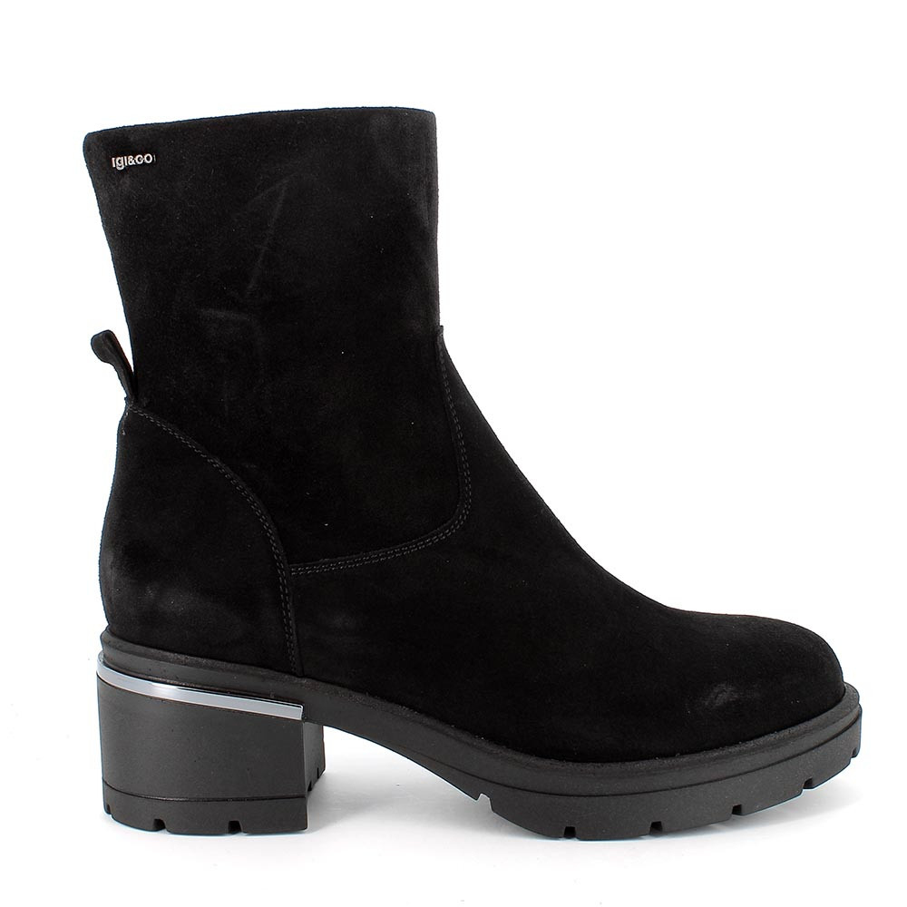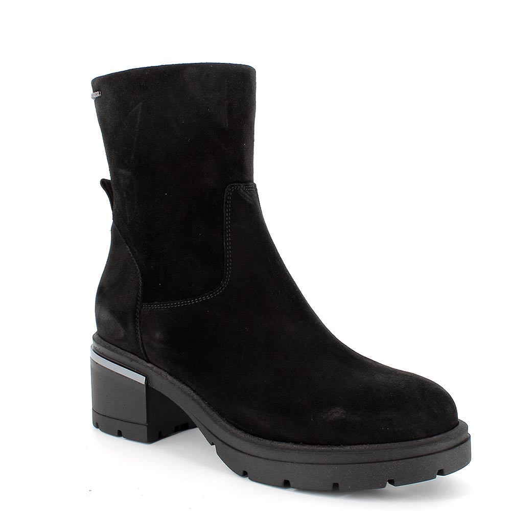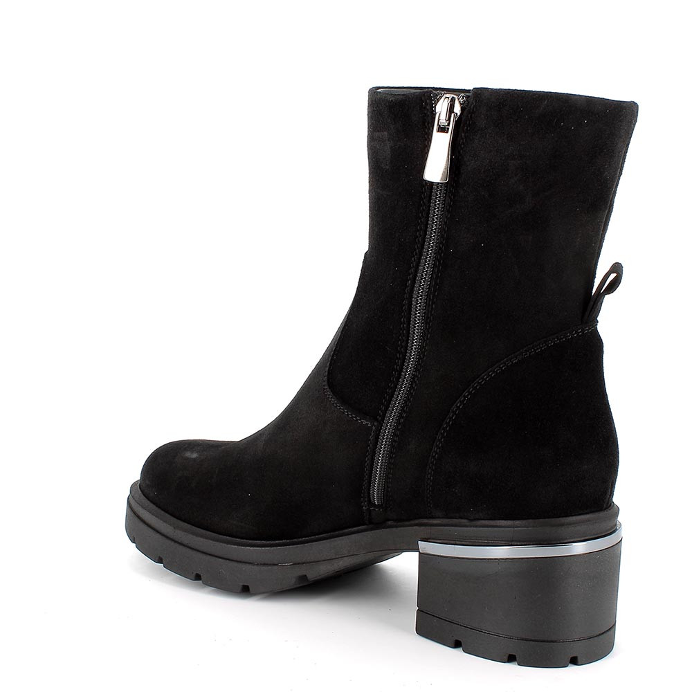 Soft suede ankle boot perfect for keeping feet and ankles warm on colder days. The silhouette of the upper is minimal and easily combined with your favorite look. The sole has a wide heel that adds centimeters without tiring. The detail of the metal effect insert gives personality and style. The anatomical insole is removable and covered in leather to ensure breathability and hygiene.