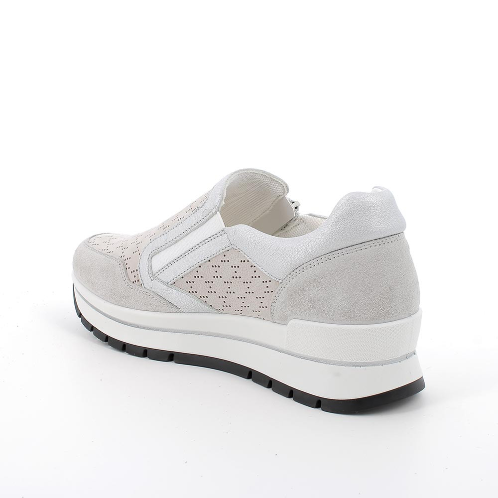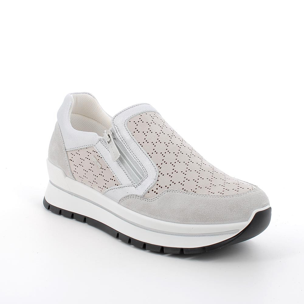 Sports shoes in leather with fretwork pattern. These sneakers without laces equipped with external zip are designed to be practical and functional. The internal elastic dowel favors a comfortable fit. The wedge sole has characteristics of high lightness and flexibility. The removable memory foam footbed is covered in leather and ensures cushioning by protecting the foot from stress.