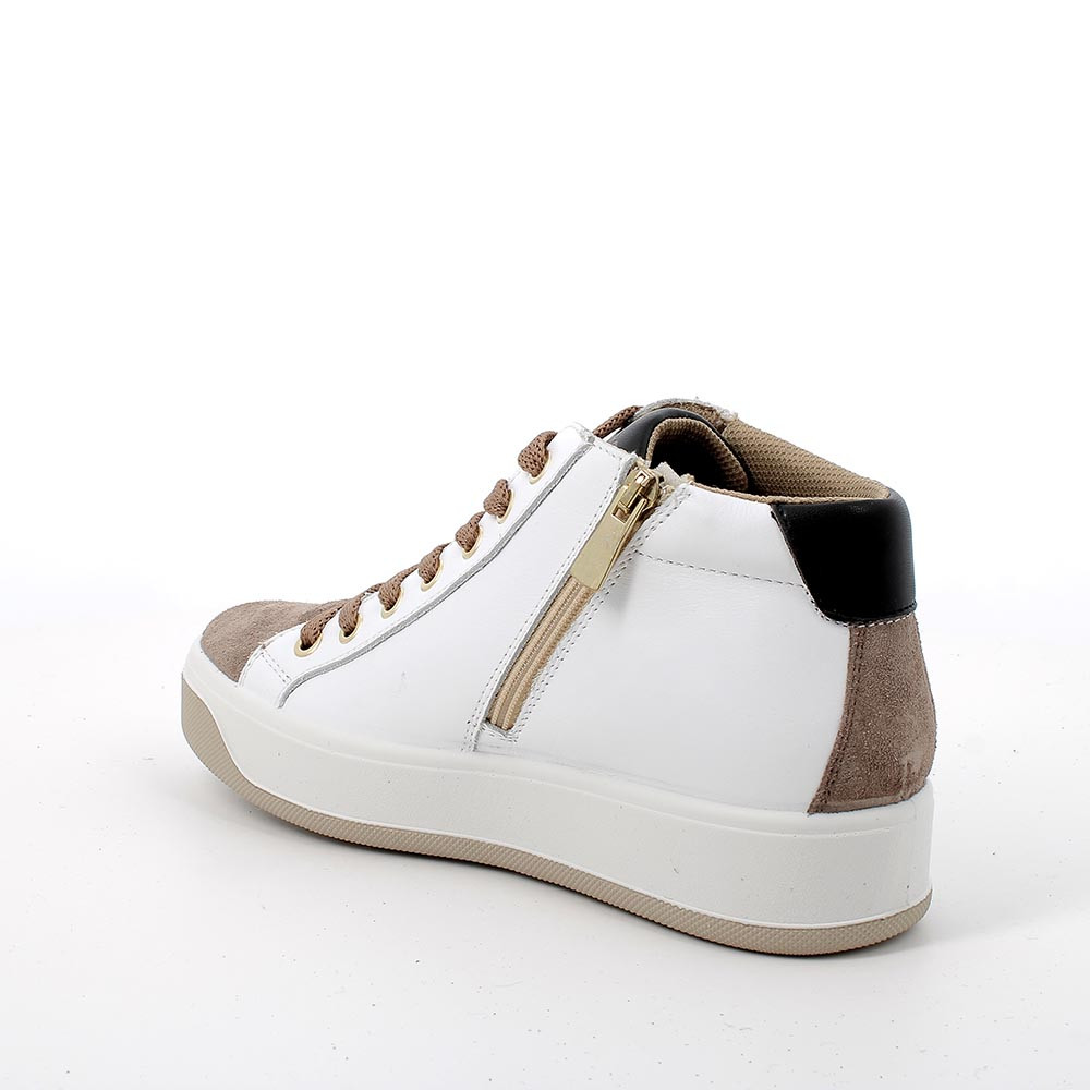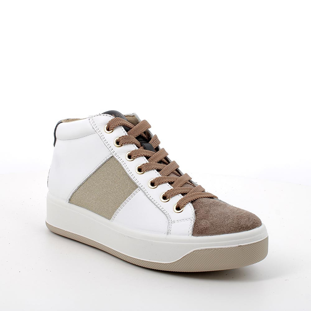 High-top leather sneakers lined in soft technical fabric to increase the feeling of comfort. They have a side band in glitter to give a touch of light to winter outfits. These shoes can be worn easily because they are designed with an internal zip. The high sole is extremely flexible and light. The anatomic insole is removable and covered in leather to ensure breathability and hygiene.