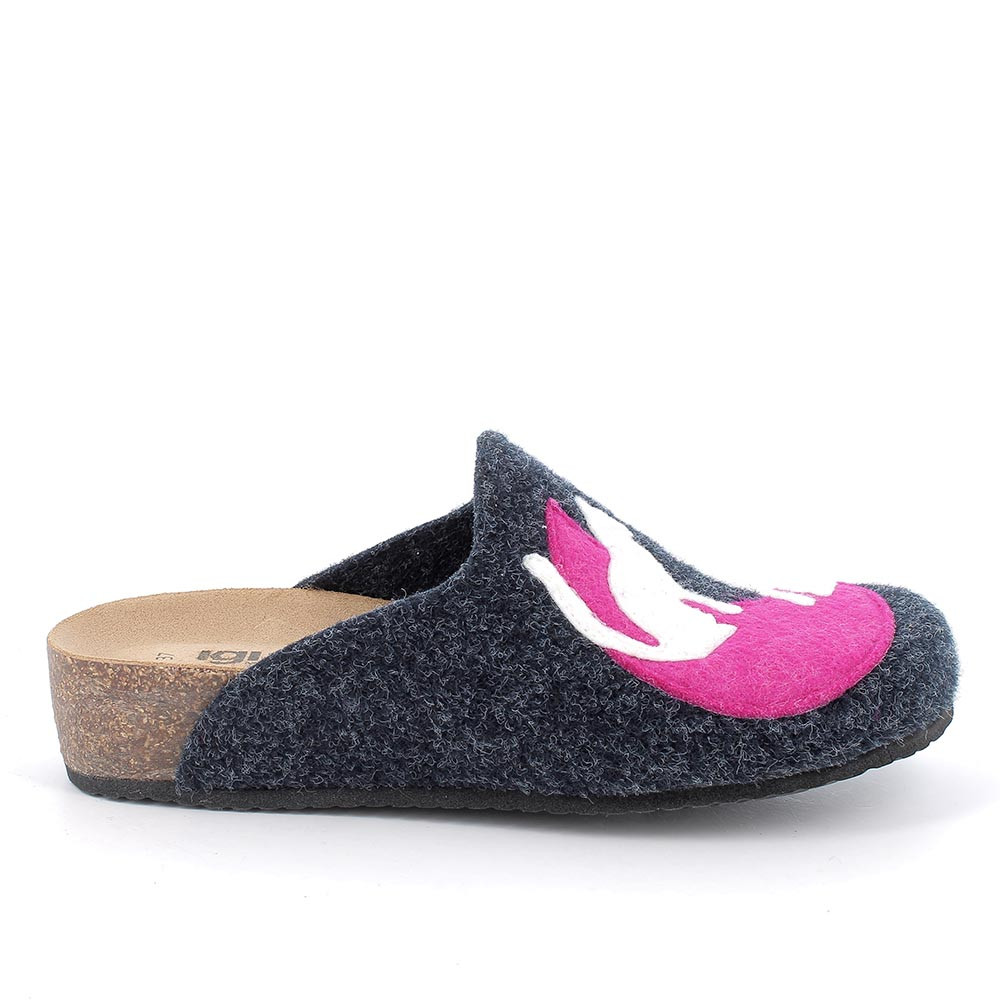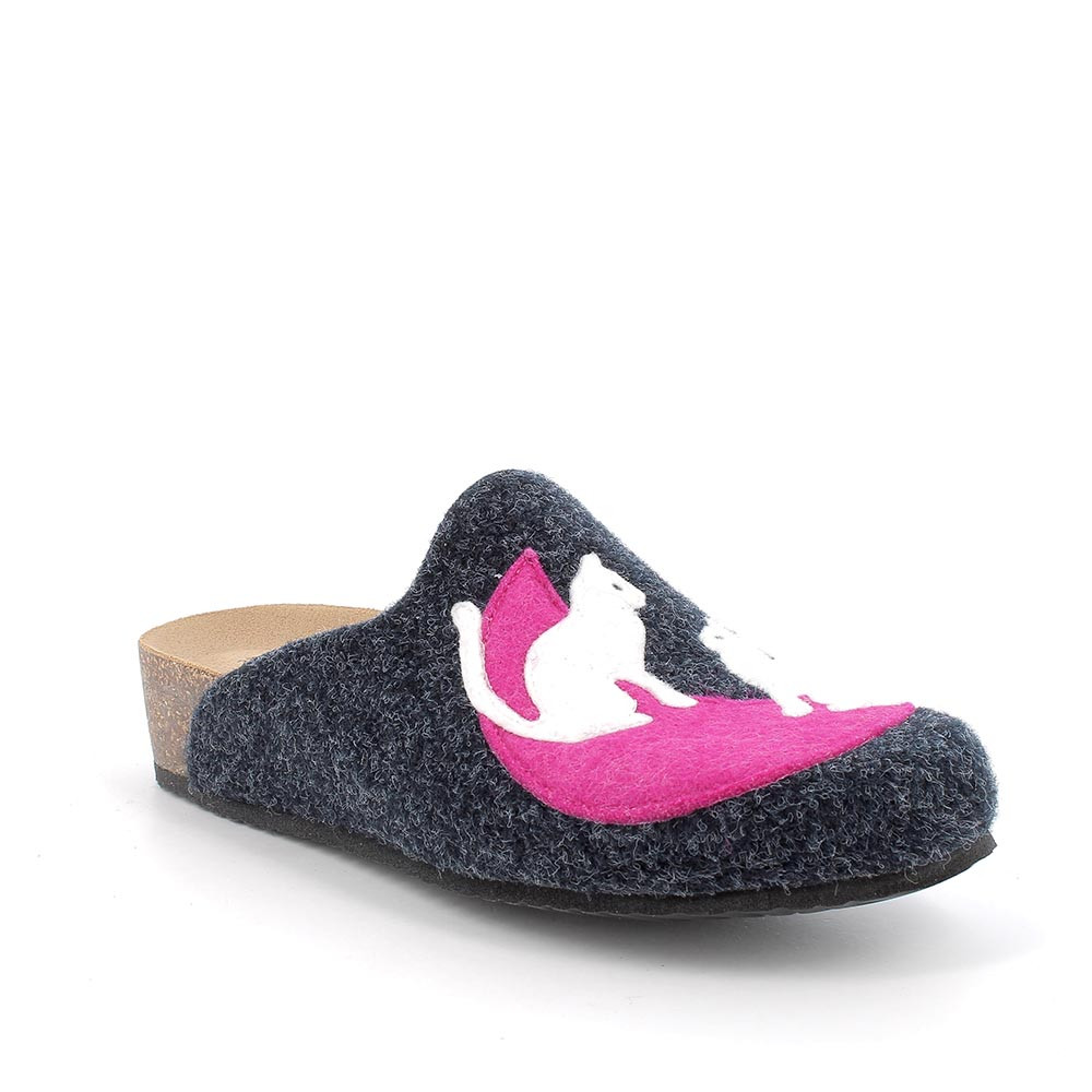These sabot-like slippers are suitable for the most romantic. The felt upper is composed of a single element that wraps around the sole and shows an elegant pattern with cats. The memory foam footbed is covered in suede and ensures cushioning and comfort throughout the day.
