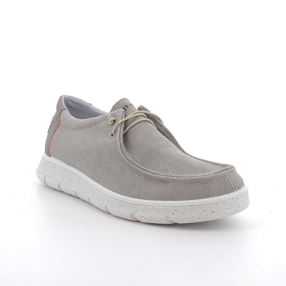 Wallaby style lace-up shoes in cotton fabric both outside and inside. They are particularly suitable for free-spirit men who like to dress informally and wear their shoes even barefoot. The sole is comfortable and wide to avoid any kind of constriction. The tread is designed to promote grip and flexibility. The anatomical insole is removable and covered in leather to guarantee breathability and hygiene.