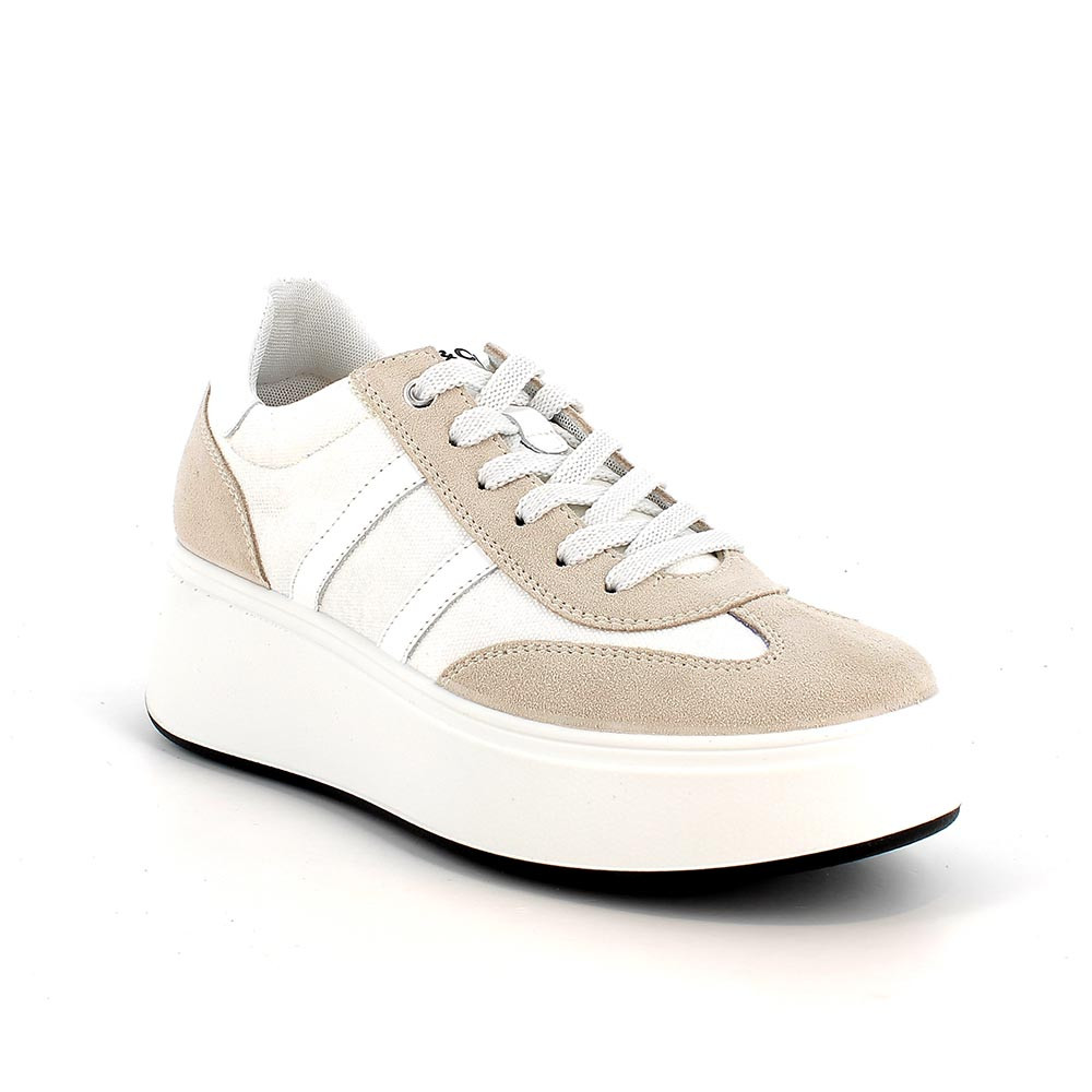 Sneakers with a clean yet super cool look, featuring a mix of materials in neutral tones and a platform sole that elongates the figure and gives character to your stride. Comfortable, lightweight, easy to match, they're the ones you slip on in a hurry and instantly feel good together: in the city, at work, or during leisure time.