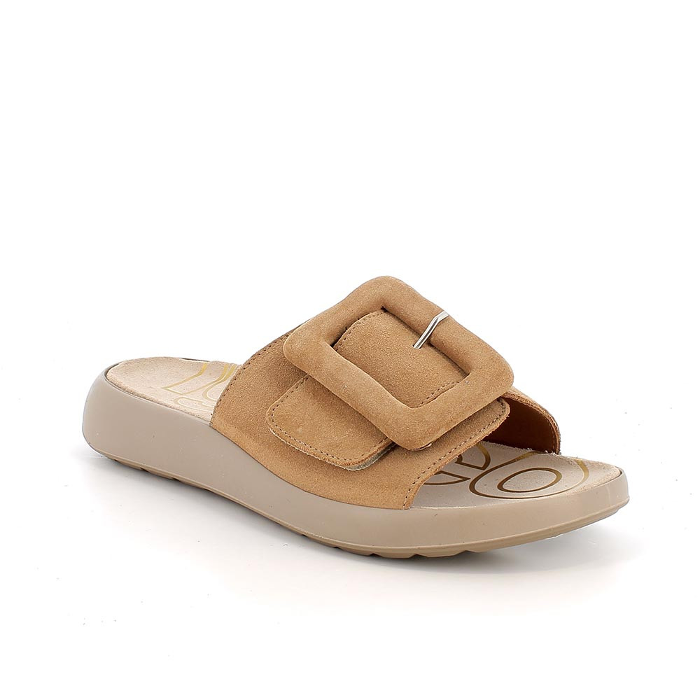 Women's slipper sandals with a contemporary and young look. The wide front band facilitates the grip on the foot and is decorated with a tone-on-tone maxi buckle that represents the characterizing element of the model. In addition to the comfortable flat sole, the anatomical footbed is made of soft suede for an additional feeling of comfort.