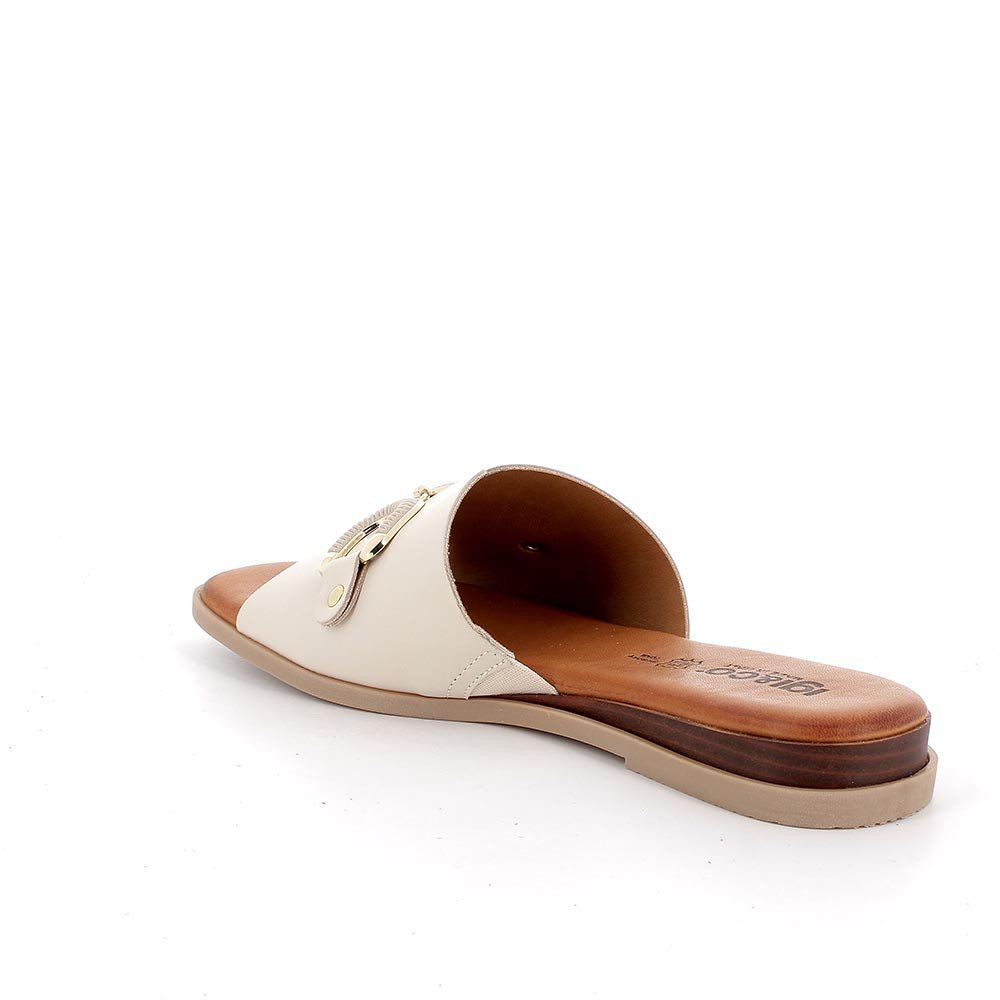 Slipper sandals with a snug upper and a strong personality. The important accessory applied on the band is very light and does not hinder movement. The lightweight wedge lifts the heel and the cushioning of the footbed with memory foam reduces the impact on the joints making them ideal for standing a lot or walking for a long time.