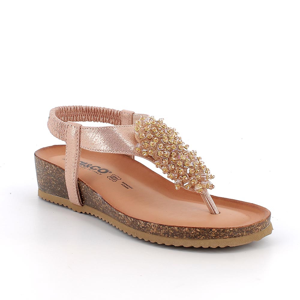 These sandals have a flip-flop construction, with a thin central strap that gently separates the toes and joins a precious decoration on the top of the foot, which catches the light and adds brilliance. The peculiarity of these sandals is the rear elastic, which wraps around the heel ensuring a practical and secure fit. The elastic is coated to harmonize with the design of the sandal, allowing the shoe to be easily put on and off.