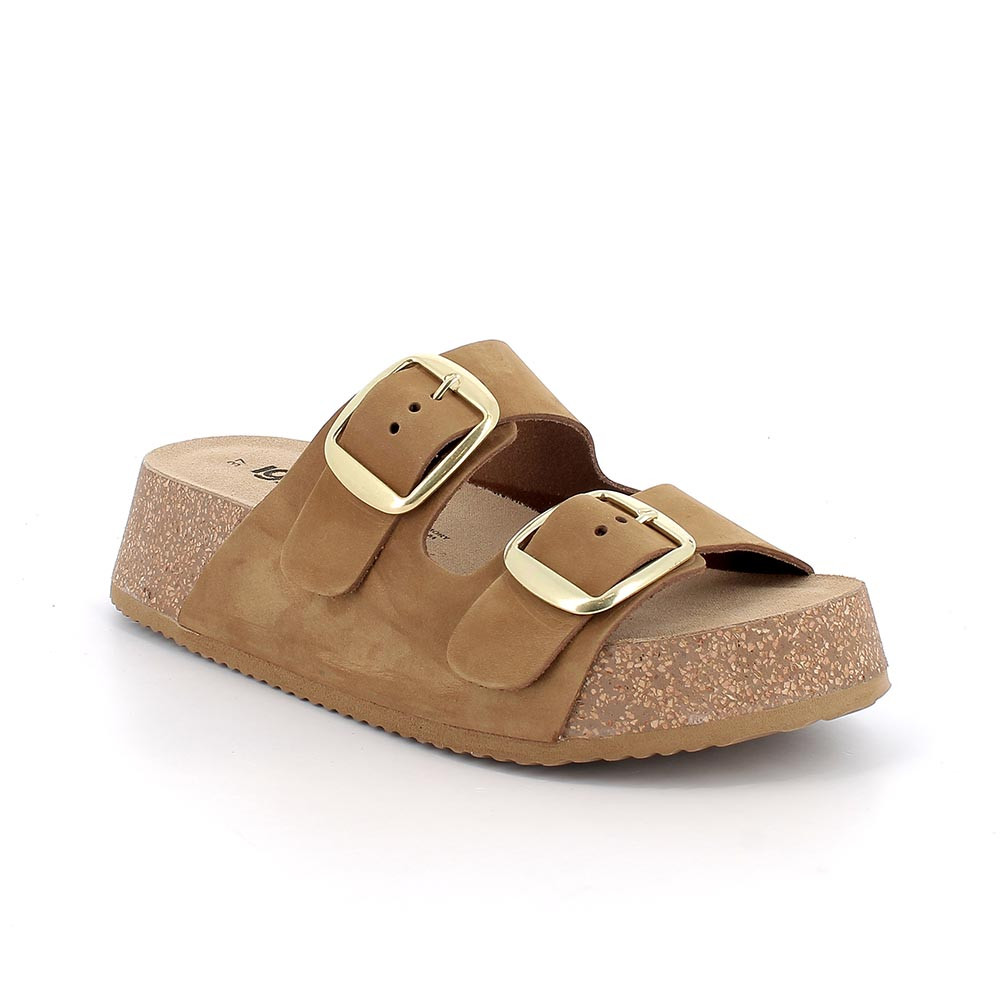 Sandals with double buckle and cork sole with a cool and contemporary look. The platform sole is lightweight and gives you comfort and a firm step. They have that effortless air that always works: you put them on and you are immediately ready to go out, to walk, to experience the summer with style and zero complications.