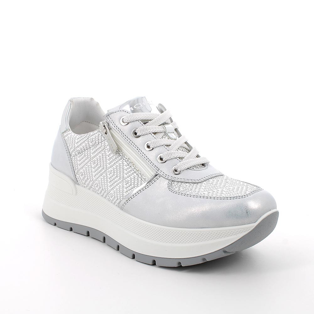 Sneakers made of laminated leather and a fabric with geometric shapes that denotes its great personality. The side zipper detail adds a practical and aesthetic touch, making it easy to put on. The soft fabric lining creates a cosy and particularly comfortable environment. The high, but very light, sole gives extra centimeters.