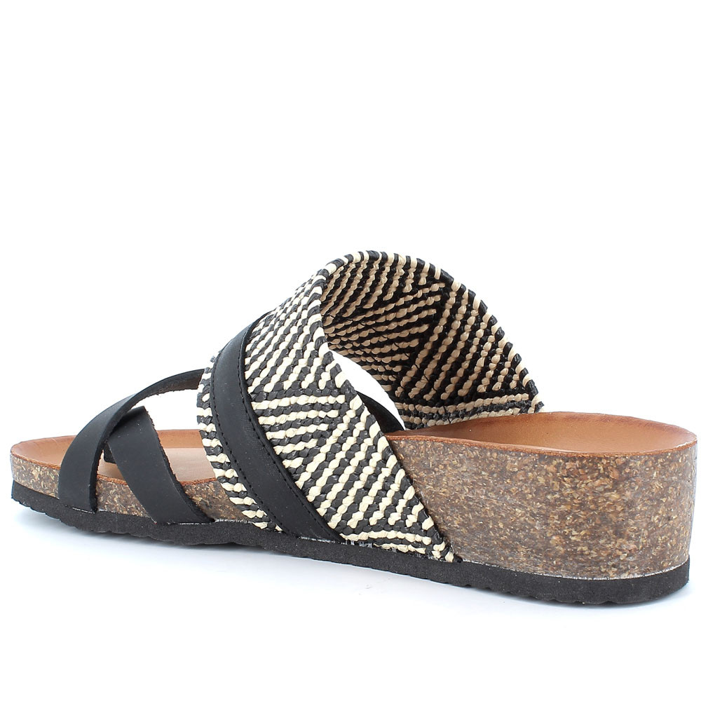 Sandalia esclava tipo chancla de esencia étnica y típicamente veraniega. Perfecta para exhaltar cualquier outfit. La ancha banda de material trenzado en el cuello del pie garantiza una óptima sujeción del pie, permitiendo caminar libremente, y además le confiere personalidad y fuerza. El detalle de espuma memory ocultado debajo de la plantilla de piel asegura un confort incomparable, reduciendo los impactos y protegiéndo las junturas.