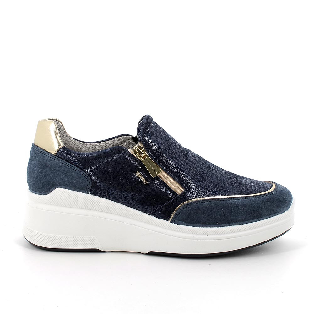 zapatilla deportiva de señora, con cuña en piel, azul vaquero