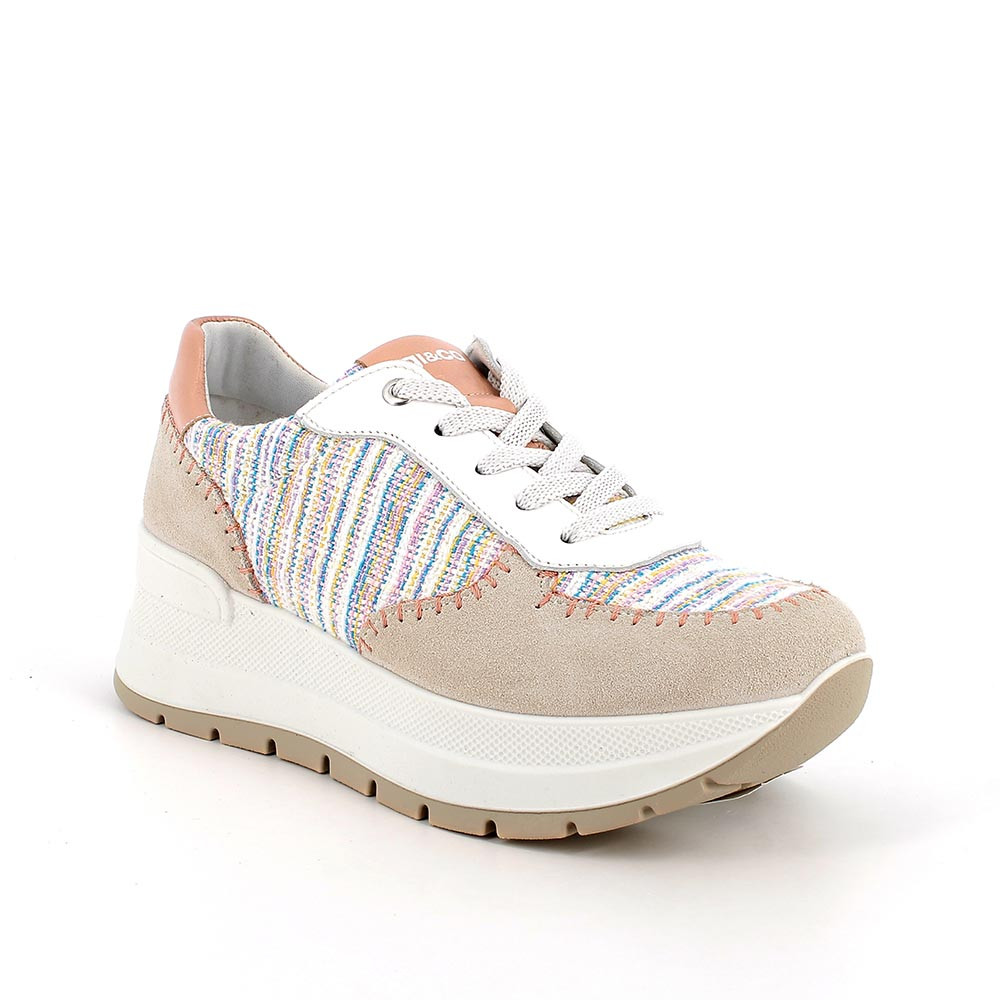 Esta zapatilla deportiva combina un estilo animado y moderno gracias a la parte superior caracterizada por una mezcla de materiales y texturas. Los pespuntes decorativos aportan un toque artesanal al diseño, mientras que el tejido a rayas añade movimiento y originalidad. La suela elevada y ultraligera proporciona comodidad y soporte, haciéndola perfecta para un uso diario.
