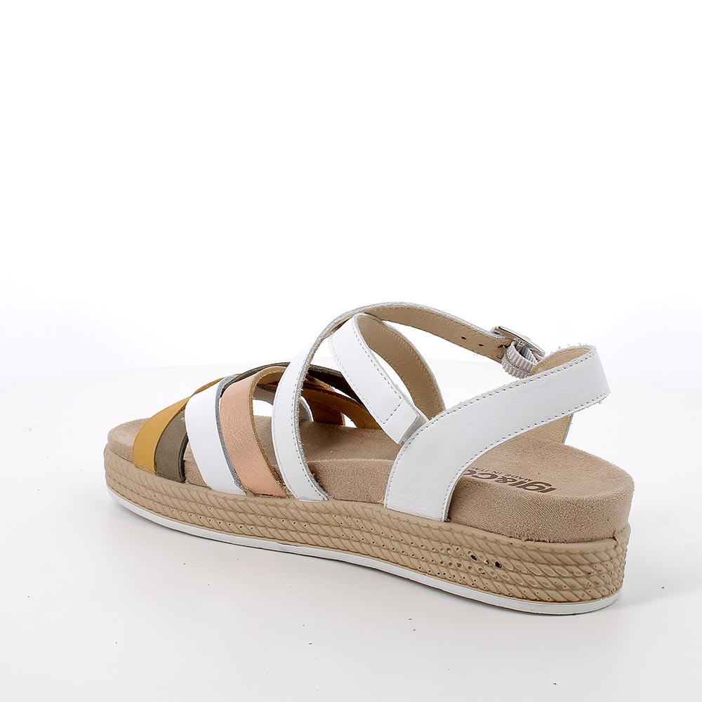 Un agradable trenzado de bandas de diversos materiales caracteriza estas sandalias de mujer. Los tonos se combinan para crear zapatos que son muy fáciles de combinar con los outfit de verano. El pie queda muy descubierto mientras es abrazado por las tiras suaves, para una mayor sensación de libertad y frescura. La forma de la plantilla y la suela facilitan suavemente los movimientos y no sobrecargan el paso.