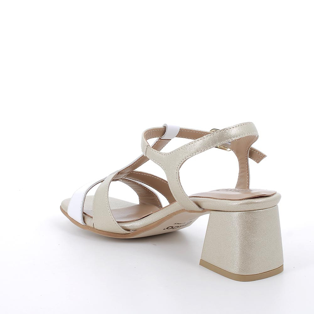 Sandalia de tacón para mujer blanco y platino con hebilla