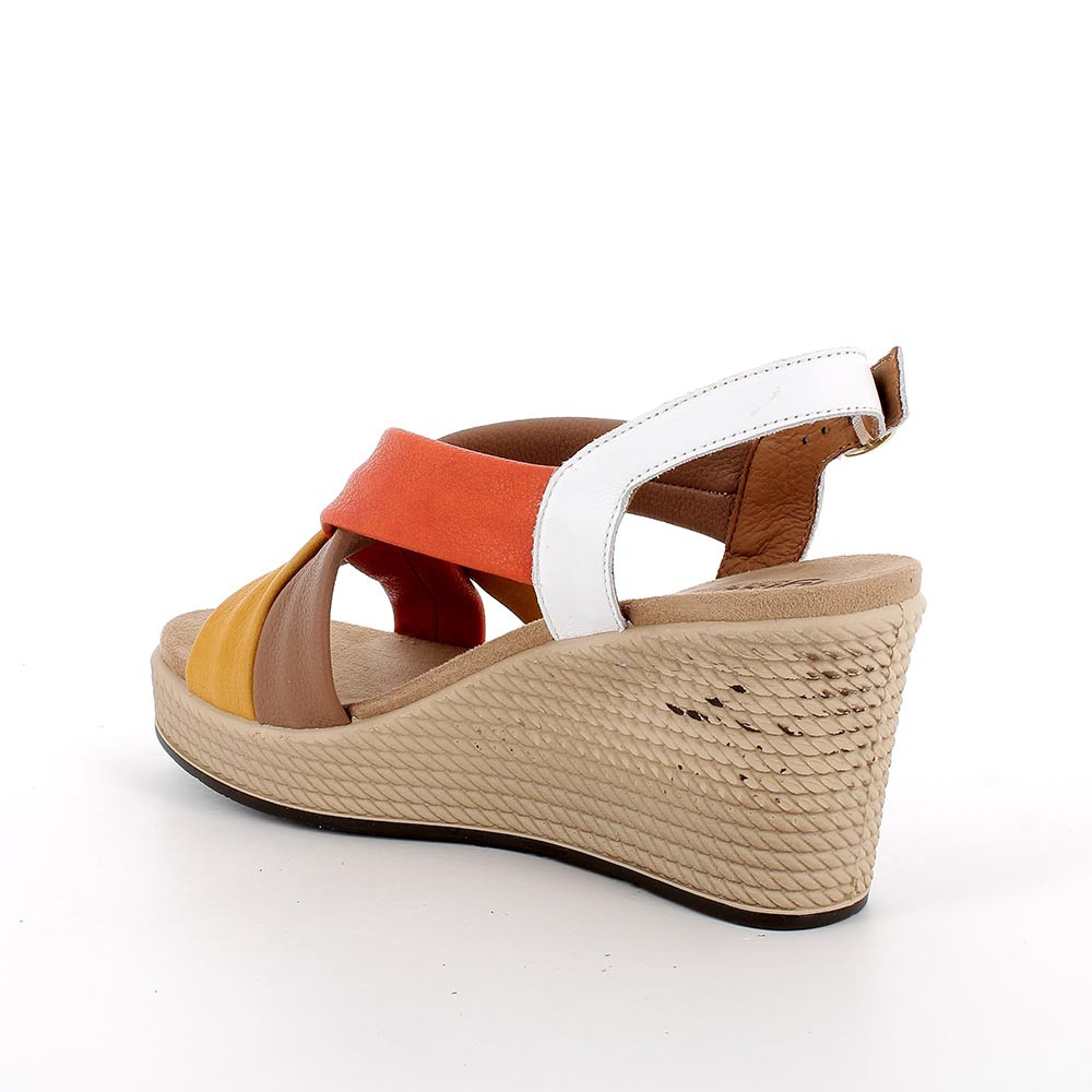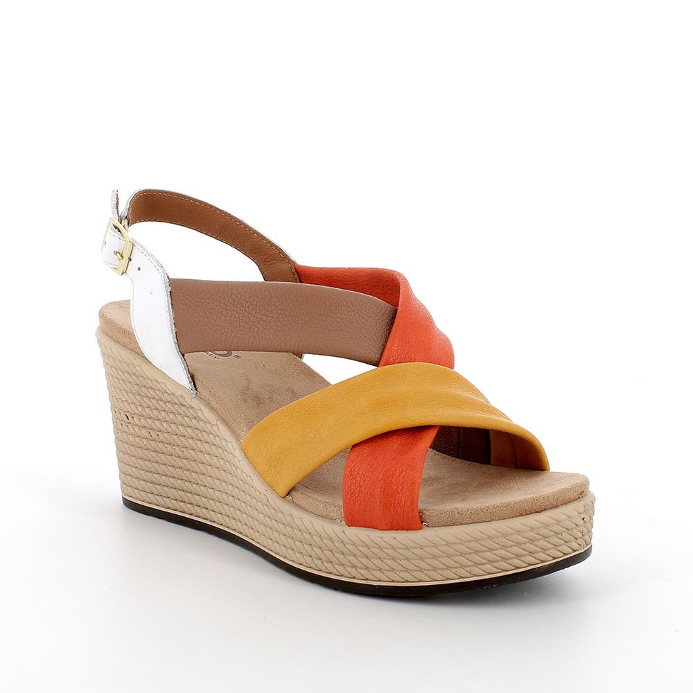 Sandalia de cuña para mujer naranja y amarillo con hebilla