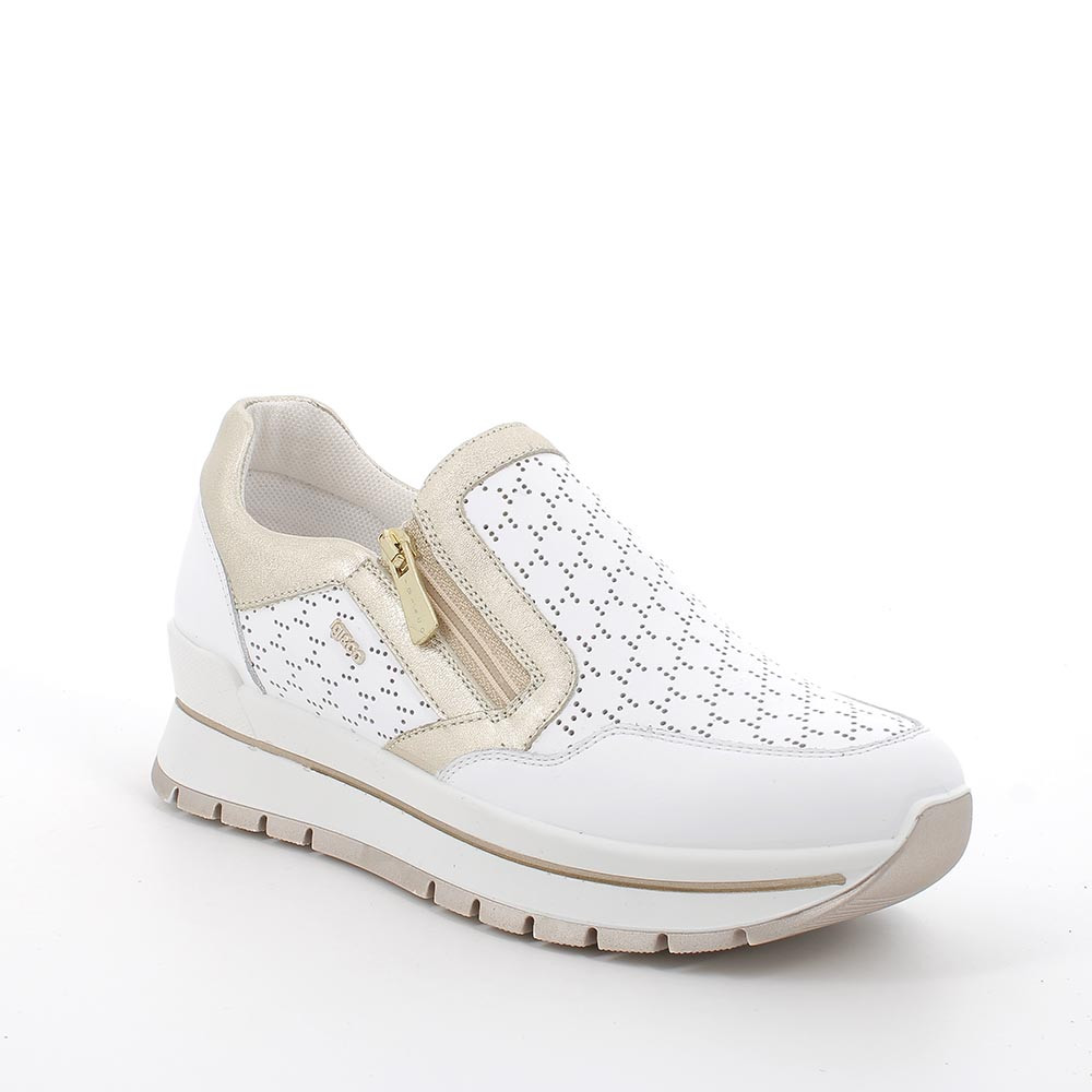 Chaussures de sport en cuir avec dessin à perforation. Ces baskets sans lacets, équipées d’un zip externe sont conçues pour être pratiques et fonctionnelles. Le goujon élastique interne favorise un ajustement confortable. La semelle en coin présente des caractéristiques de grande légèreté et de flexibilité. La semelle intérieure amovible en mousse à mémoire de forme est recouverte de cuir et assure l’amorti en protégeant le pied du stress.