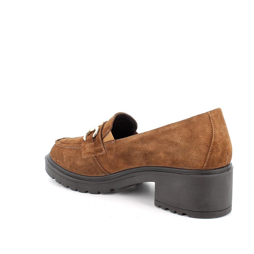 Mocassin en cuir avec talon. Élastiques pour faciliter l'ajustement. Bout et pince ornementaux. Convient à toutes les occasions avec une jupe ou un pantalon. Semelle intérieure amovible en cuir.