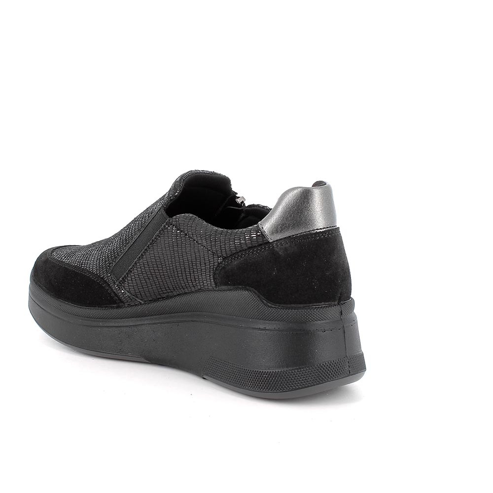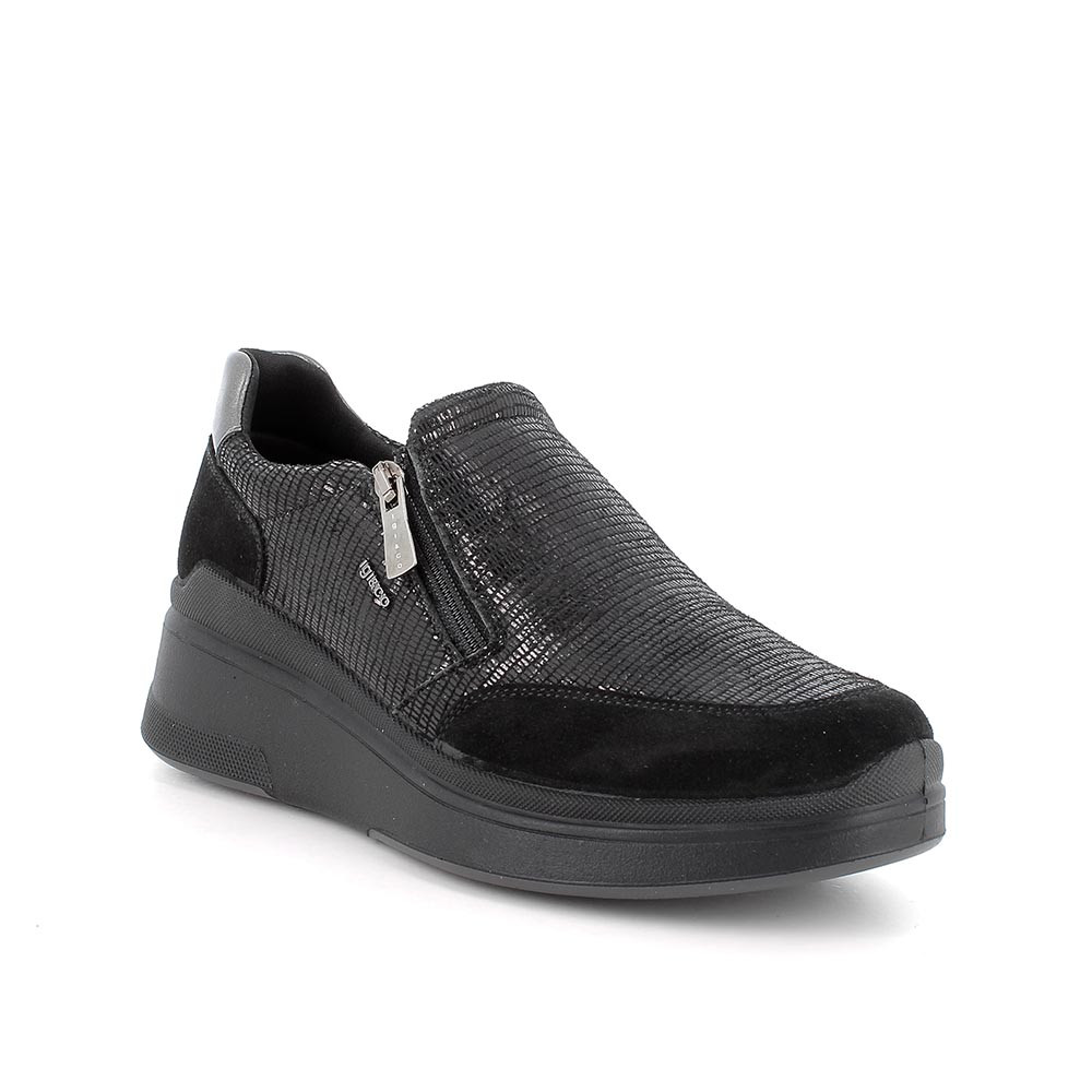 Slip-on avec un léger coin qui assure une marche confortable. Ces chaussures sont en suède souple. Fermeture élastique et zip latéral pour un ajustement facile. La semelle intérieure amovible en cuir garantit une hygiène maximale.