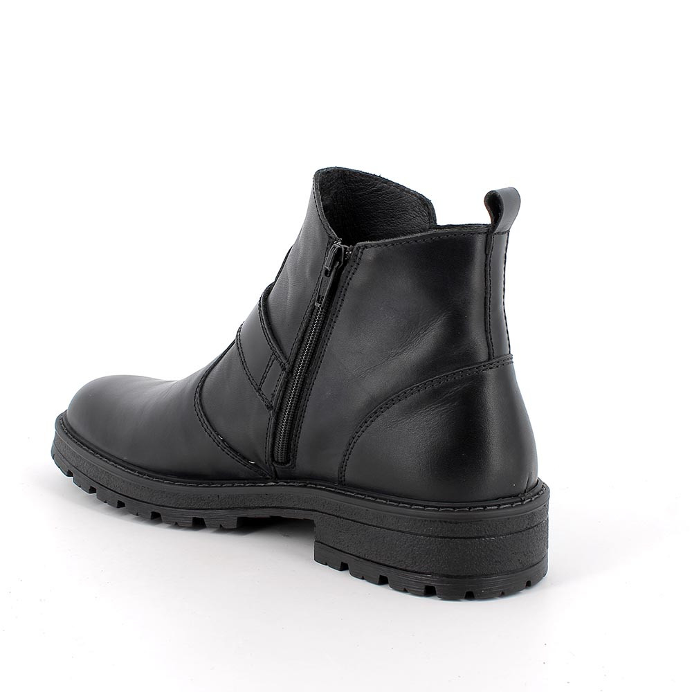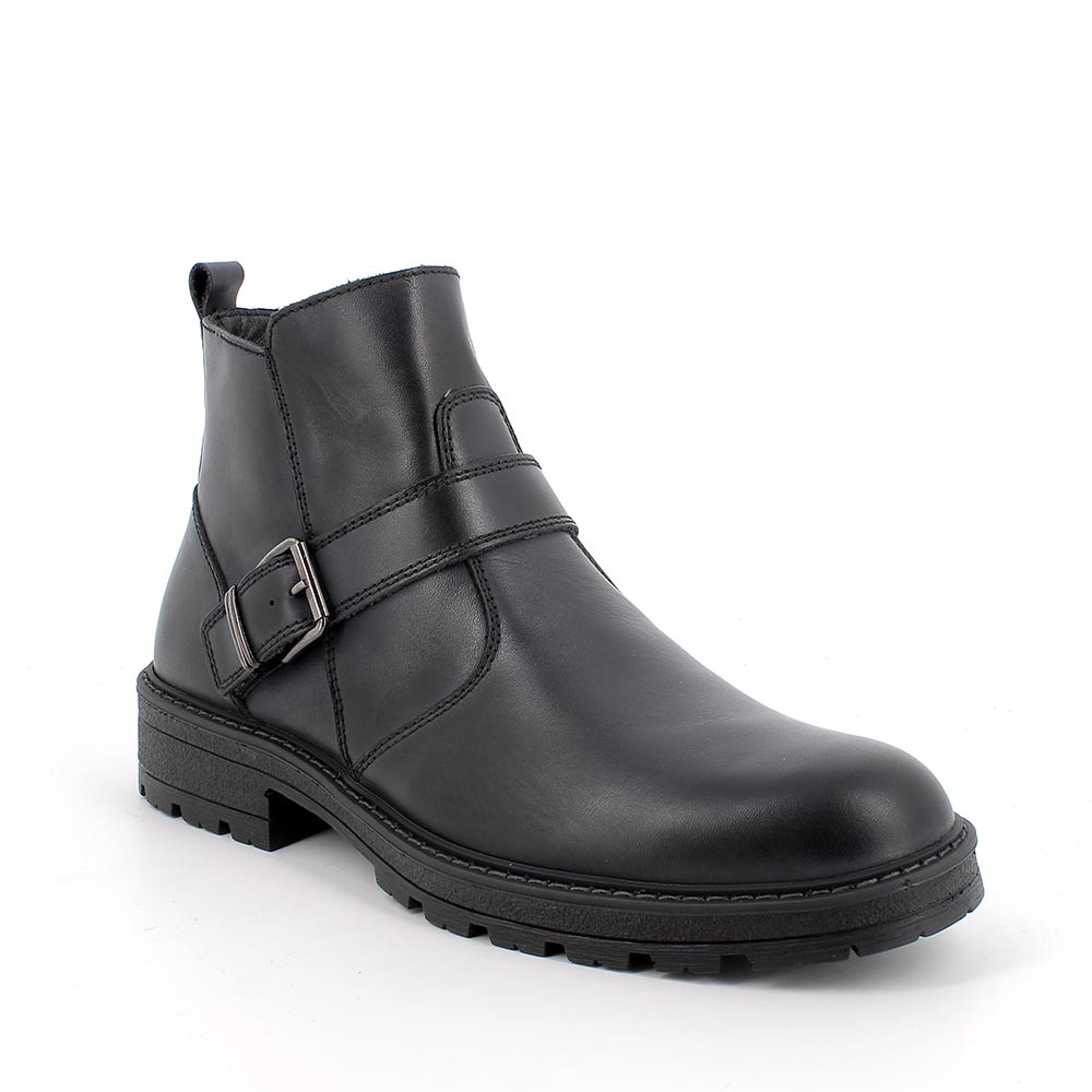 Ces bottines pour hommes en cuir sont la parfaite synthèse entre un style classique et un esprit déterminé. Le détail de la boucle latérale ajoute une touche distinctive et audacieuse à une silhouette sobre. La tige en cuir lisse confère une apparence élégante et soignée, tandis que la semelle robuste et crantée garantit stabilité et confort même les jours les plus froids ou humides. Le design avec fermeture éclair intérieure permet un chaussant rapide et sécurisée. Parfaites à porter avec des jeans ou des pantalons en laine, ces bottines s'adaptent facilement à la vie urbaine quotidienne avec une touche de personnalité en plus.
