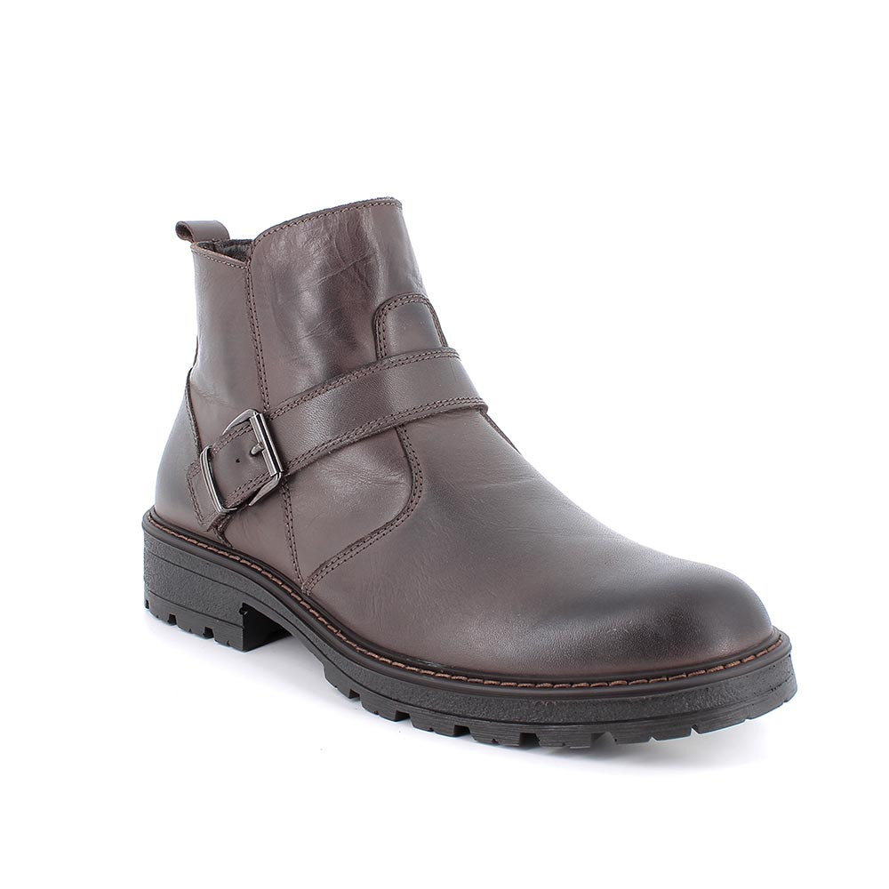 Ces bottines pour hommes en cuir sont la parfaite synthèse entre un style classique et un esprit déterminé. Le détail de la boucle latérale ajoute une touche distinctive et audacieuse à une silhouette sobre. La tige en cuir lisse confère une apparence élégante et soignée, tandis que la semelle robuste et crantée garantit stabilité et confort même les jours les plus froids ou humides. Le design avec fermeture éclair intérieure permet un chaussant rapide et sécurisée. Parfaites à porter avec des jeans ou des pantalons en laine, ces bottines s'adaptent facilement à la vie urbaine quotidienne avec une touche de personnalité en plus.