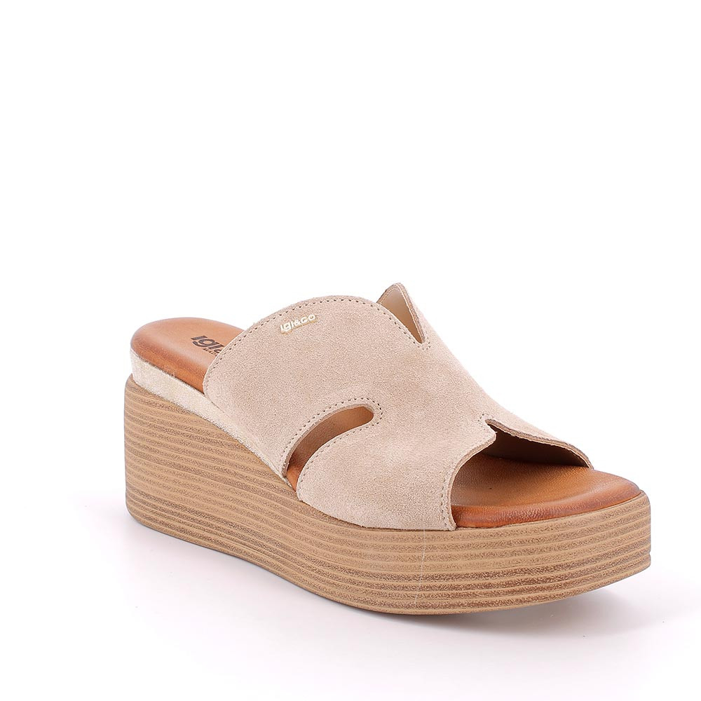 Ces sandales ont une structure à pantoufle, caractérisée par une seule bande avant qui couvre la partie supérieure du pied, donnant un look minimal et sophistiqué. La semelle compensée est haute et robuste, mais en même temps très légère, idéale pour affiner la silhouette. La semelle a un effet bois, ce qui donne une touche naturelle et rustique, avec des grains rappelant la surface du bois. Une semelle intérieure en mousse à mémoire de forme complète l’ensemble.