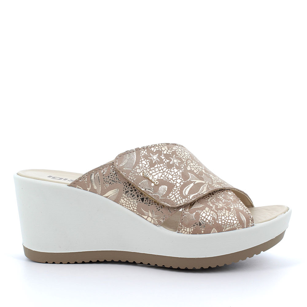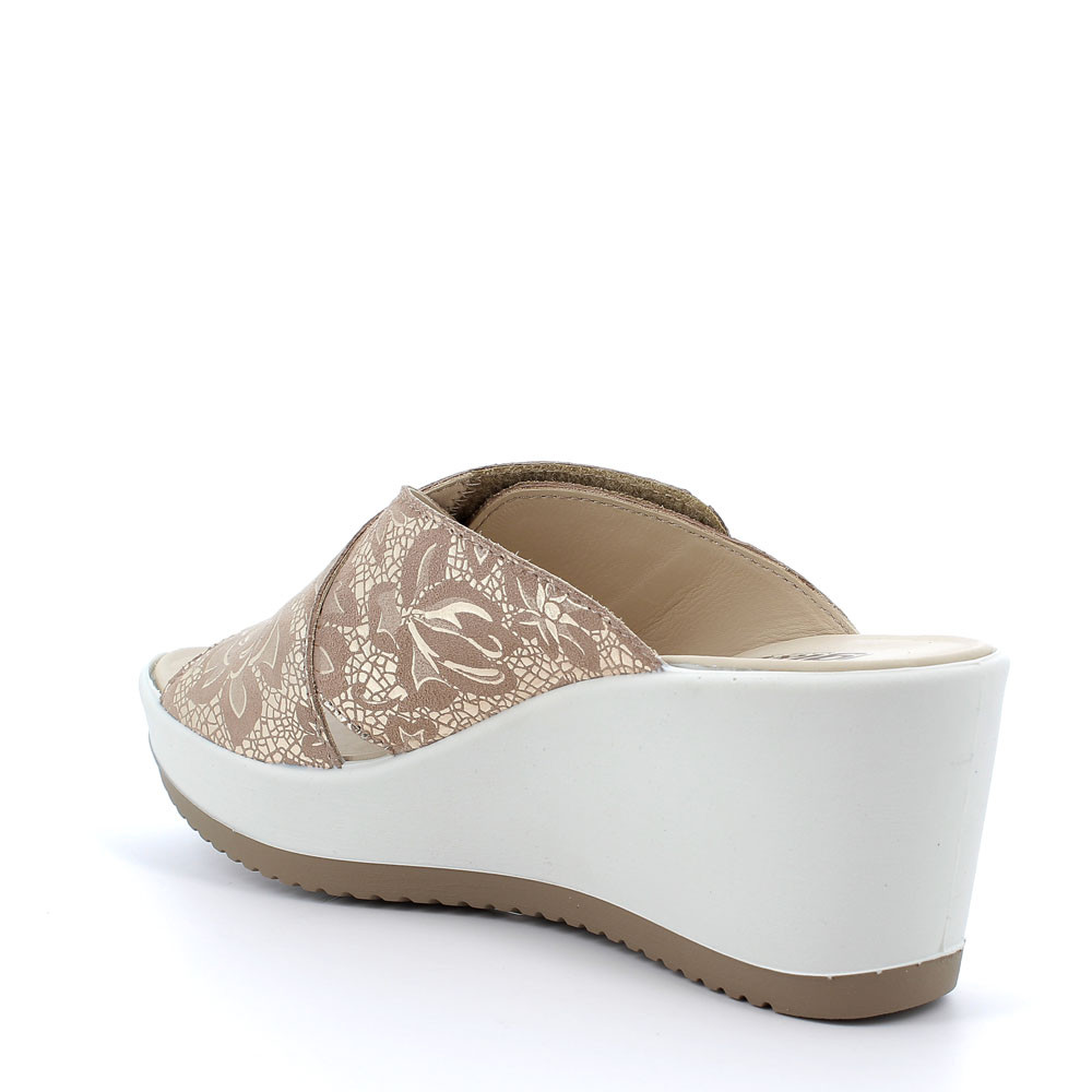 SANDALO DAL DIETRO APERTO IN MORBIDA PELLE STAMPATA CON ELEGANTE MOTIVO FLOREALE TONO SU TONO. LA TOMAIA VESTE COME UN GUANTO E PUÒ ESSERE ANCHE ADATTATA ALLA CONFORMAZIONE DEL PROPRIO PIEDE. LA PARTICOLARE SILHOUETTE DELLA ZEPPA, LA RENDE ESTREMAMENTE COMODA E CONFORTEVOLE ANCHE PER UN UTILIZZO PROLUNGATO. ULTERIORE ELEMENTO CONNOTANTE È LA LEGGEREZZA, IMPRESCINDIBILE IN UNA CALZATURA ESTIVA.