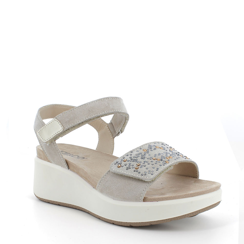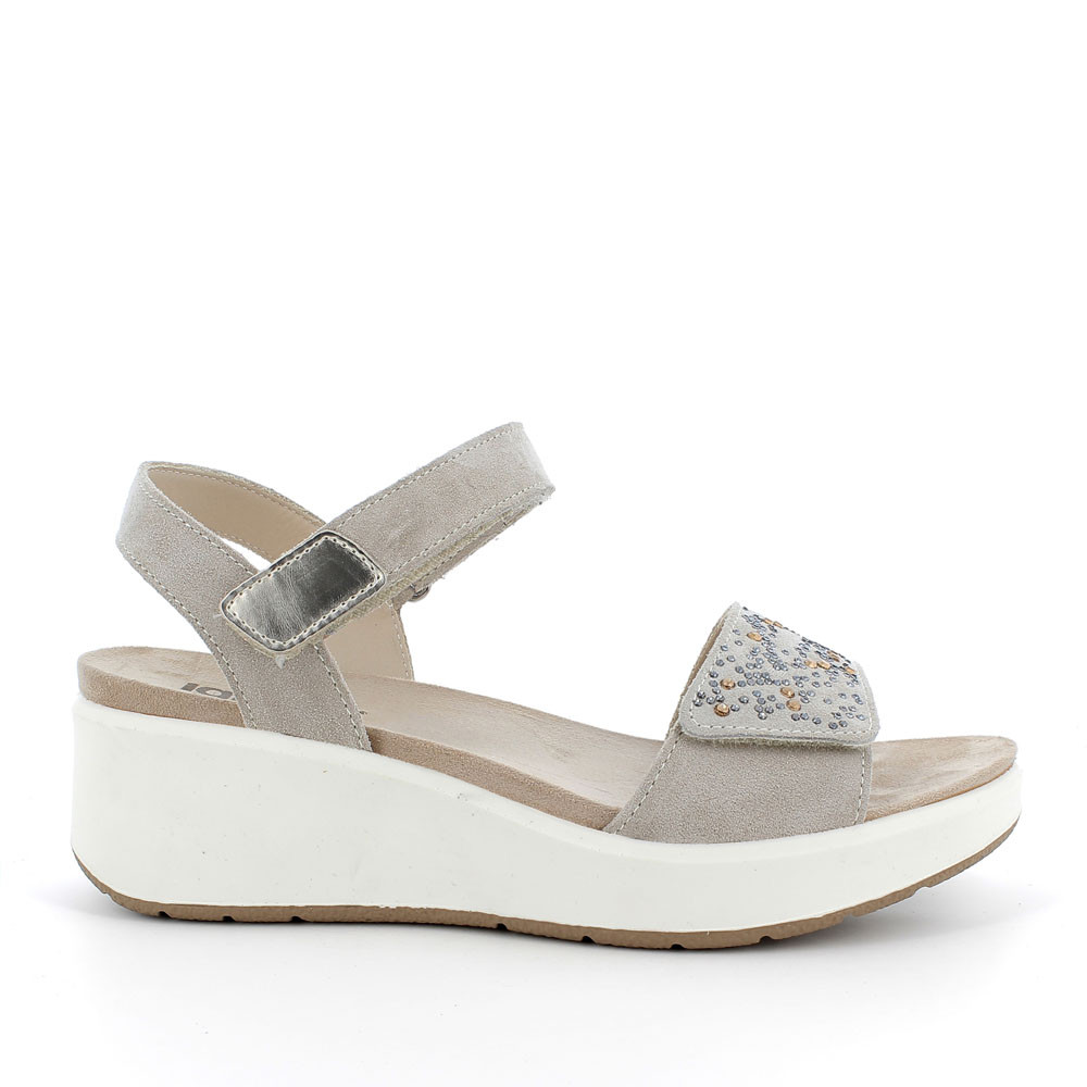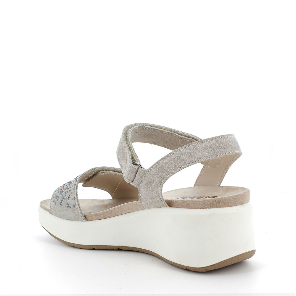 SANDALO IN MORBIDA PELLE SCAMOSCIATA DALLA SILHOUETTE SEMPRE ATTUALE, CON FASCIA ANTERIORE REGOLABILE IMPREZIOSITA DA DELICATO MOTIVO IN STRASS. SI REGOLA AGEVOLMENTE CON STRAP ALLA CAVIGLIA. SFOGGIA UNA ZEPPA LINEARE DI MEDIA ALTEZZA CHE SLANCIA LA FIGURA ED È AL CONTEMPO COMODA E LEGGERA.