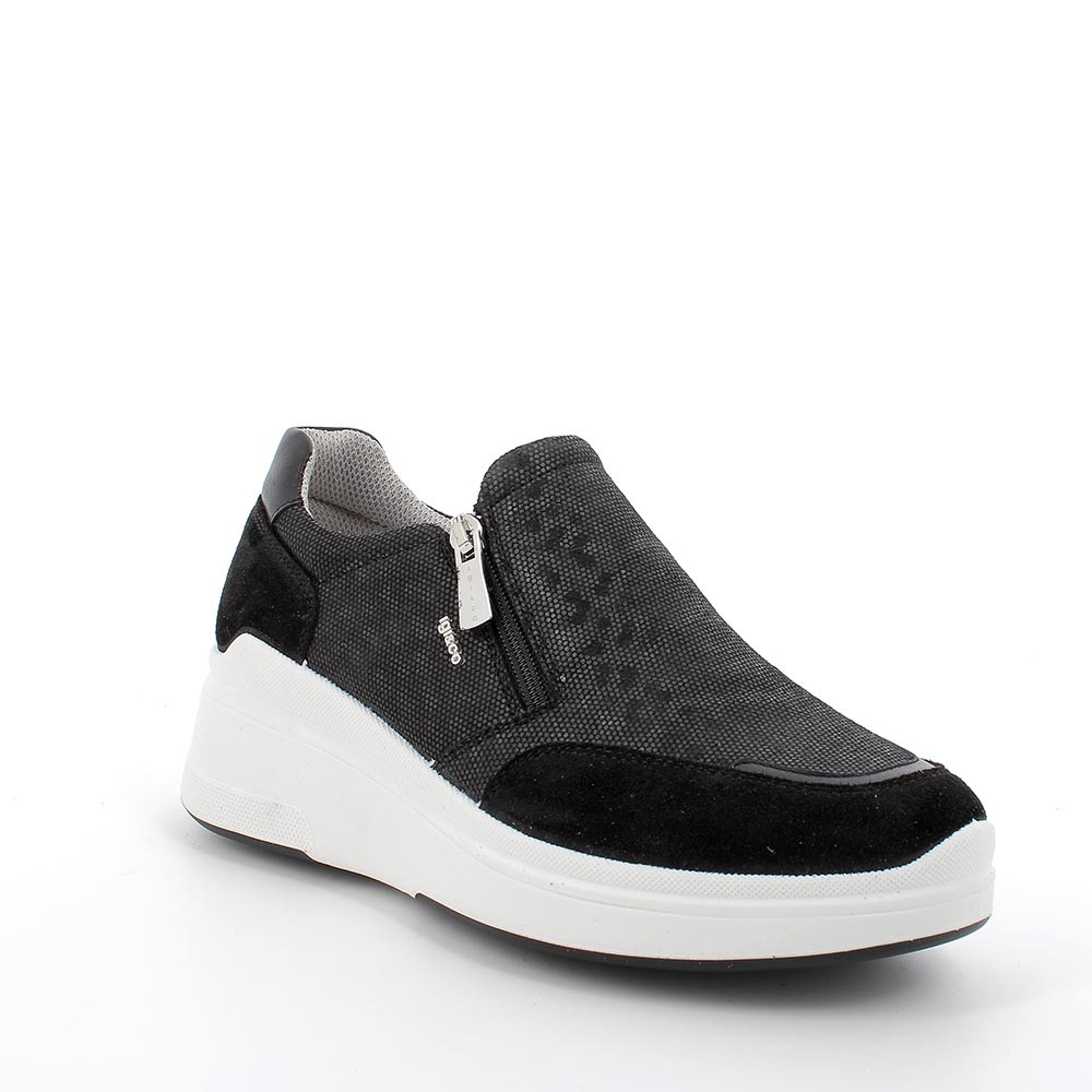 Queste scarpe sportive rappresentano un ibrido tra le sneakers e le slip on. Prive di stringhe, sono dotate di un tassello elastico interno e di una zip esterna che rendono facilissimo infilarle e sfilarle. La linea di queste calzature è essenziale e si sposa benissimo con la particolarità della morbida pelle utilizzata. La suola ha elevate doti di leggerezza e flessibilità. Il sottopiede anatomico è estraibile e rivestito in pelle per assicurare traspirabilità e igiene.