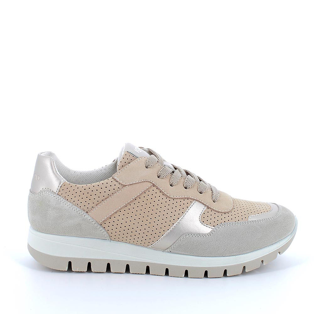 Sneakers dalle linee tradizionali interpretate in chiave estiva grazie all'utilizzo di una morbida pelle. Pratica e versatile, si abbina facilmente agli outfit cittadini. La suola sportiva, in stile running, ha battistrada con scanalature e punta rialzata per assicurare massimo grip e agevolare la camminata. Il sottopiede anatomico è estraibile e rivestito in pelle per assicurare traspirabilità e igiene.