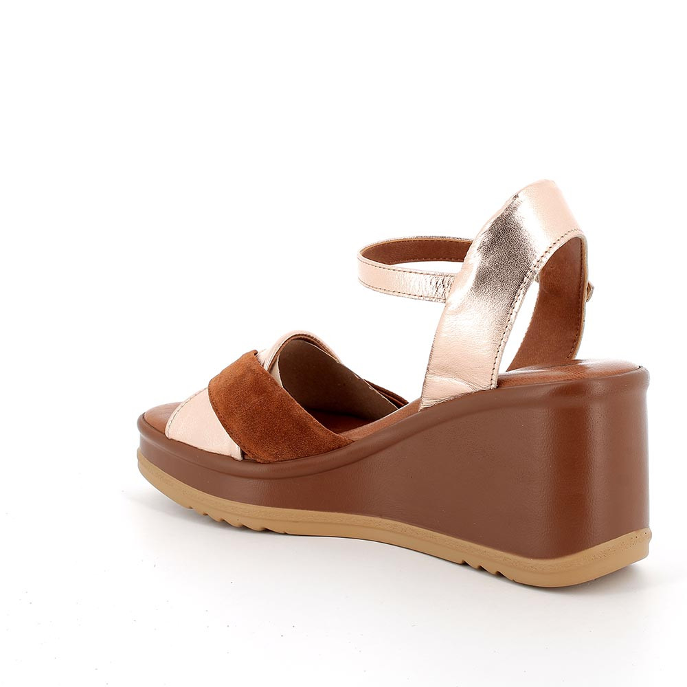 Sandalo con zeppa in pelle da donna cipria-cuoio