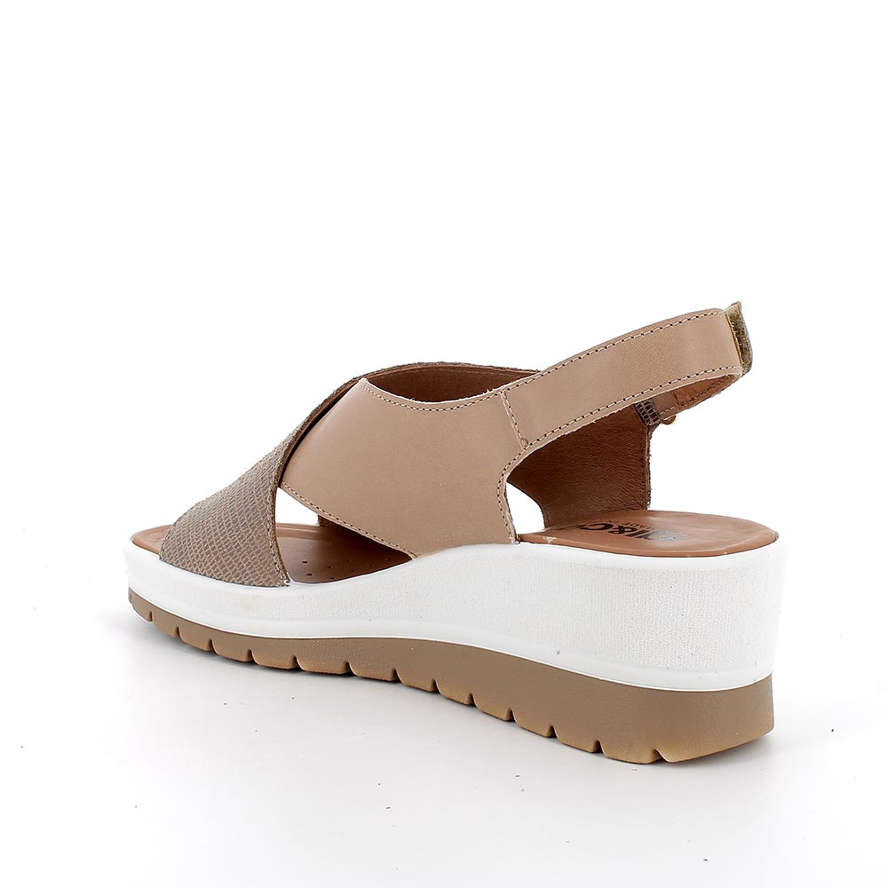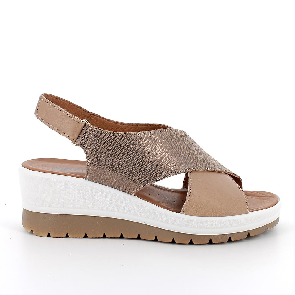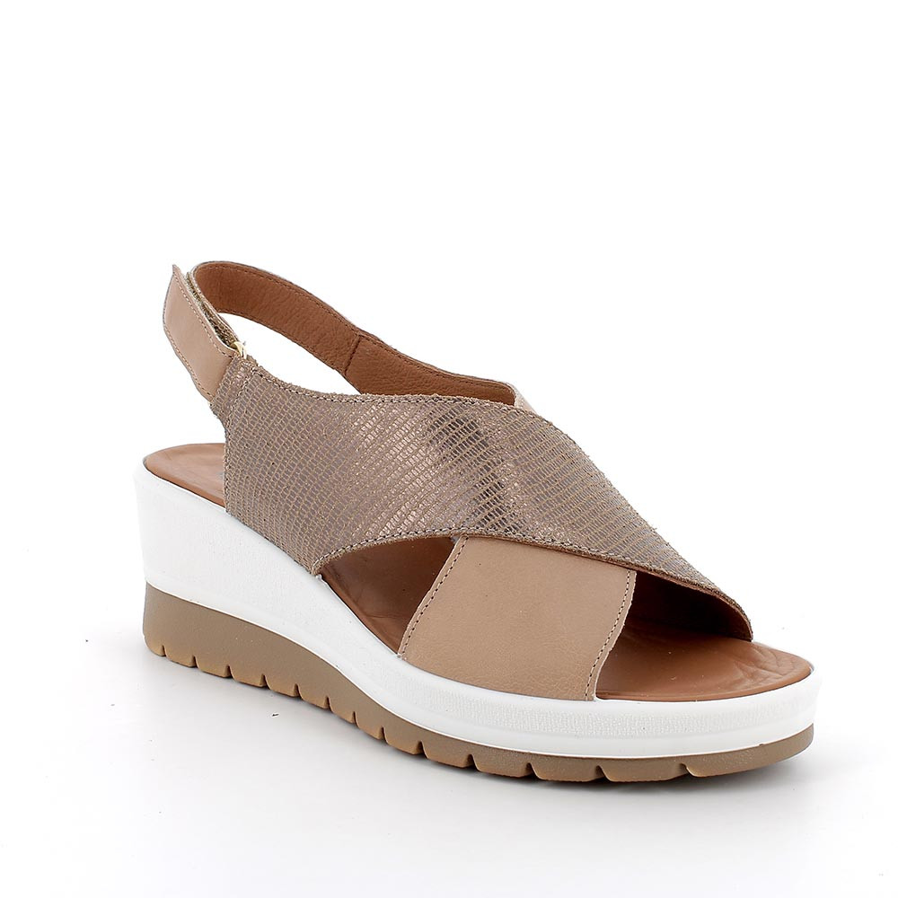 I sandali a doppia fascia incrociata sono tornati di grande tendenza nelle ultime stagioni. Igi&Co li propone in pregiata pelle per un gusto ancora più estivo ed attuale. Questo modello ha una calzata avvolgente e salda e può essere regolato posteriormente con un pratico velcro. Il sottopiede è in pelle. La suola a zeppa ha una altezza ideale per garantire comodità ad ogni tuo passo ed un battistrada seghettato che assicura una migliore presa sul terreno.