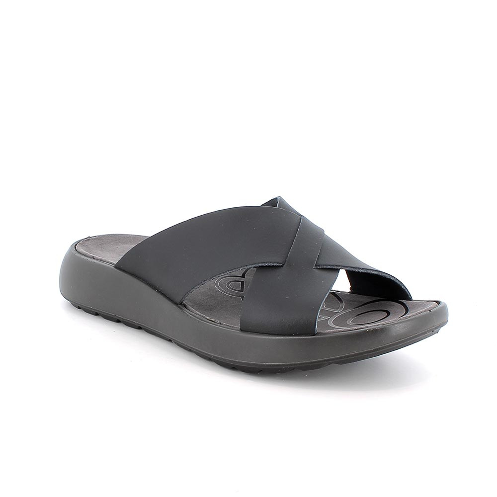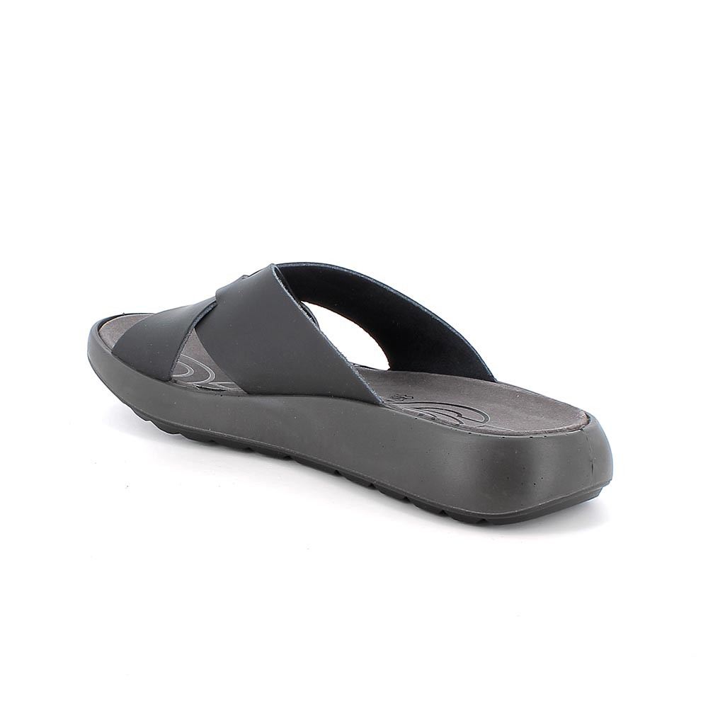 Sandali dal design moderno che presentano una tomaia a fasce incrociate, che avvolgono delicatamente il piede offrendo una calzata sicura e confortevole. La struttura ergonomica è studiata per supportare il piede, rendendoli ideali per un uso prolungato. La suola, realizzata in materiale leggero e resistente, è dotata di proprietà ammortizzanti per assorbire gli impatti durante la camminata. Il plantare in pelle scamosciata restituisce una sensazone di morbidezza unica.