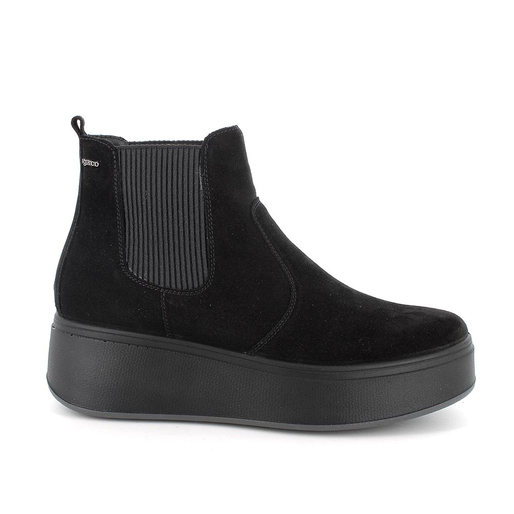Stivaletti beatles con zeppa e plateau per un comfort superiore ed il massimo isolamento dal suolo. Realizzati in morbida pelle scamosciata, si indossano in un attimo, aiutandosi con il tirante posteriore. Il sottopiede anatomico può essere estratto per una maggiore igiene.