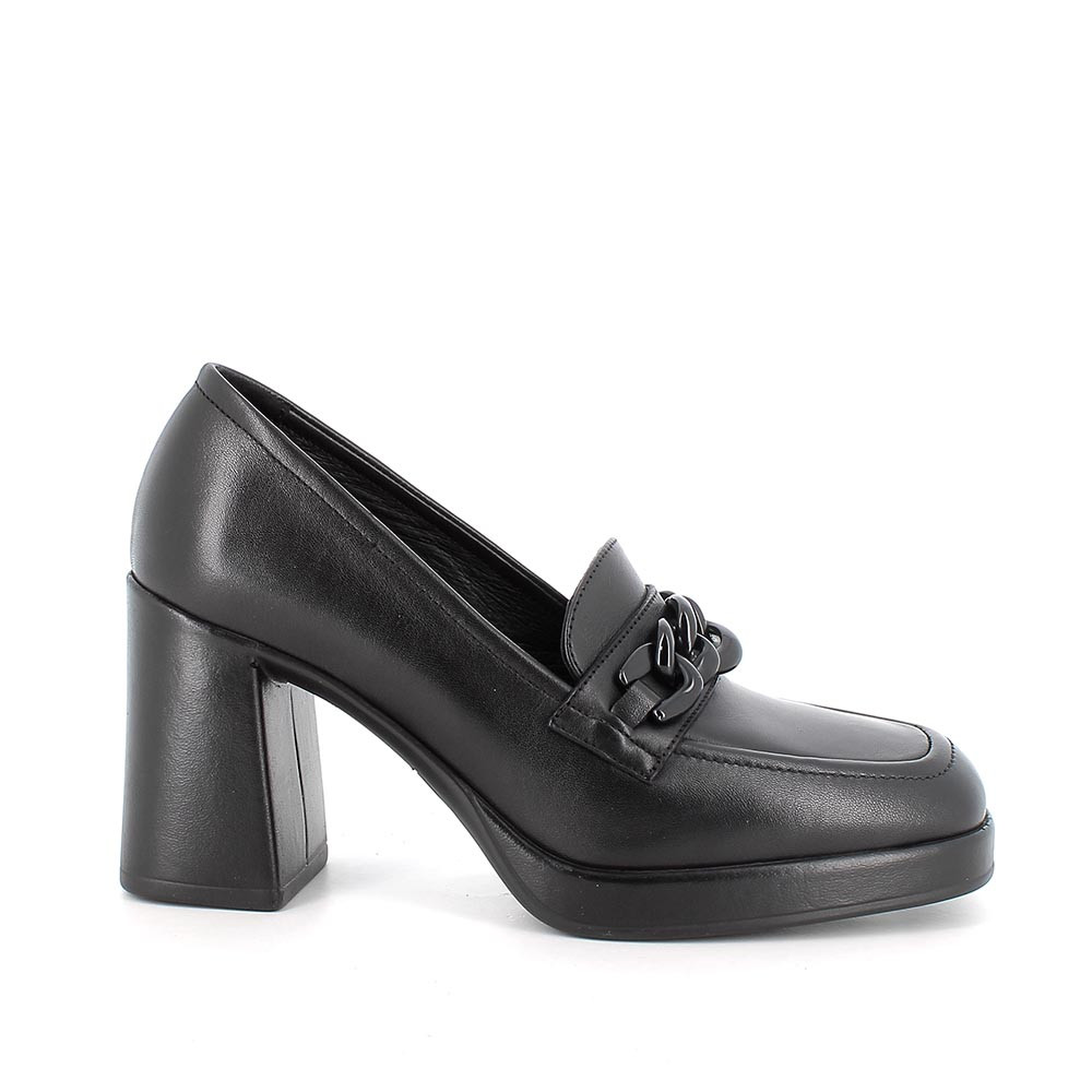 Questi mocassini con tacco alto sono perfetti per una donna che si fa ispirare dalle tendenze del momento. Il tacco è largo e sul davanti hanno il plateau, quindi assicurano comodità. Sono entrambi rivestiti, indice di grande qualità. L'accessorio sul collo del piede completa il look di questo modello passe-par-tout.