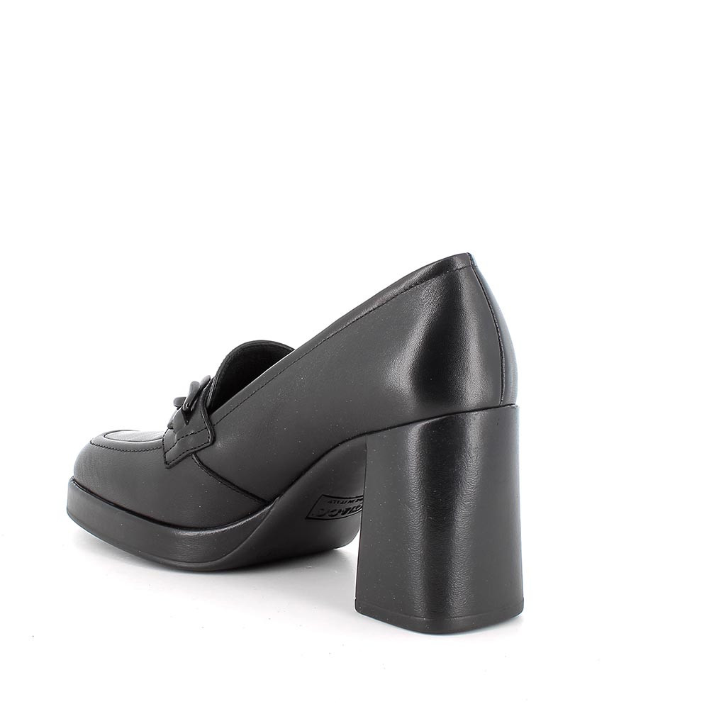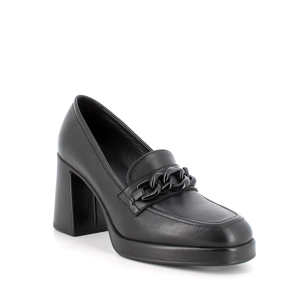 Questi mocassini con tacco alto sono perfetti per una donna che si fa ispirare dalle tendenze del momento. Il tacco è largo e sul davanti hanno il plateau, quindi assicurano comodità. Sono entrambi rivestiti, indice di grande qualità. L'accessorio sul collo del piede completa il look di questo modello passe-par-tout.