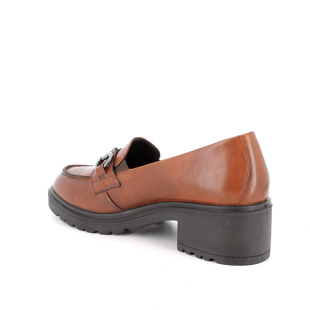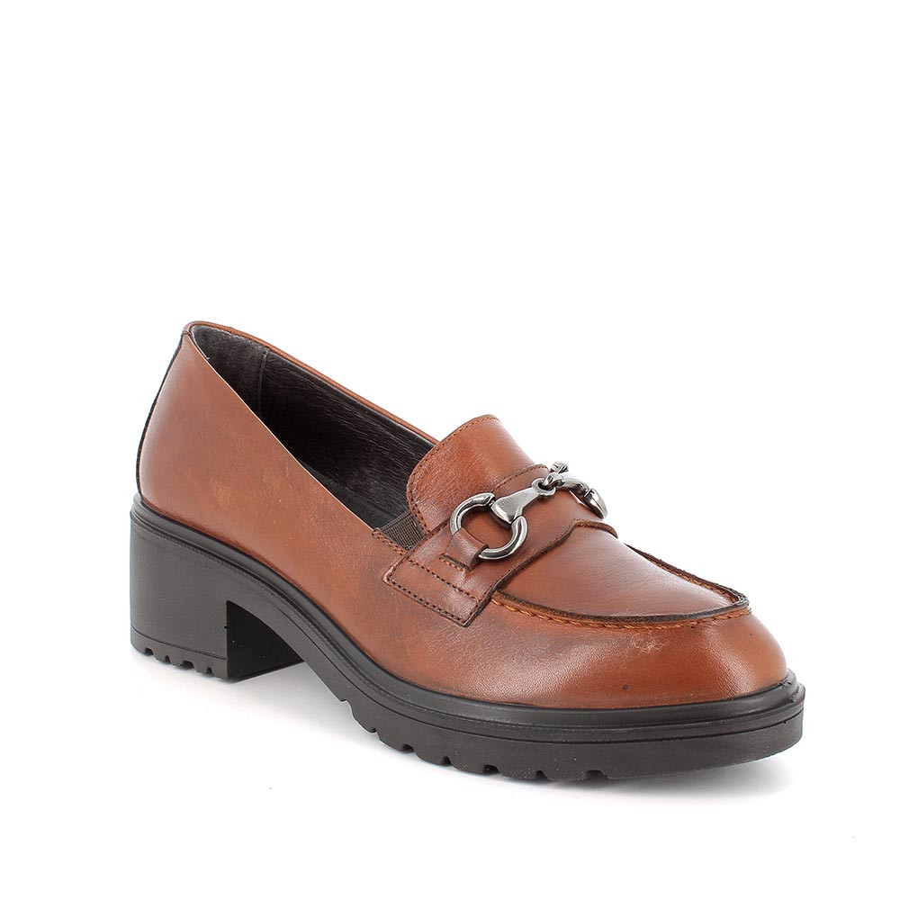 Mocassini con tacco in pelle da donna cognac