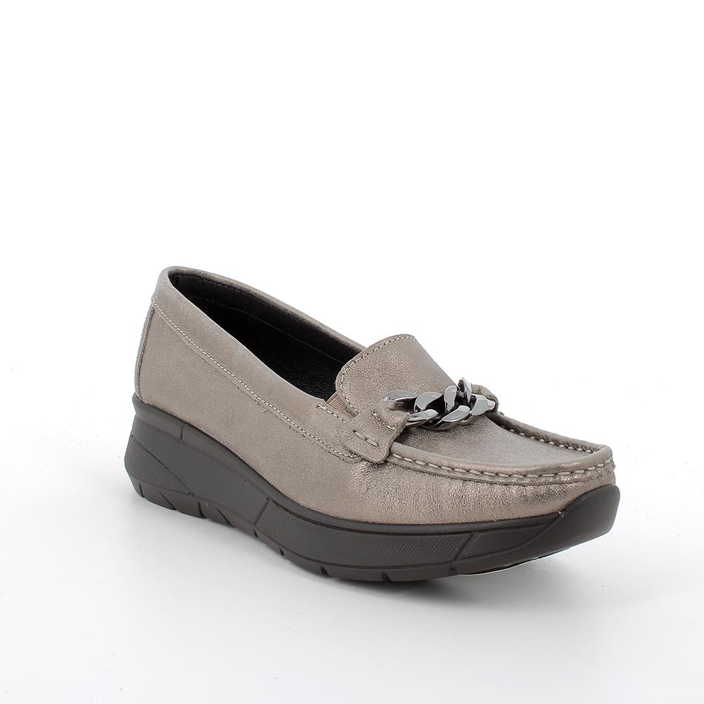 Mocassini in pelle con leggera zeppa per una calzata molto comoda. Morsetto ornamentale ed elastici per facilitare la calzata. Fodera e sottopiede in pelle per massima igiene