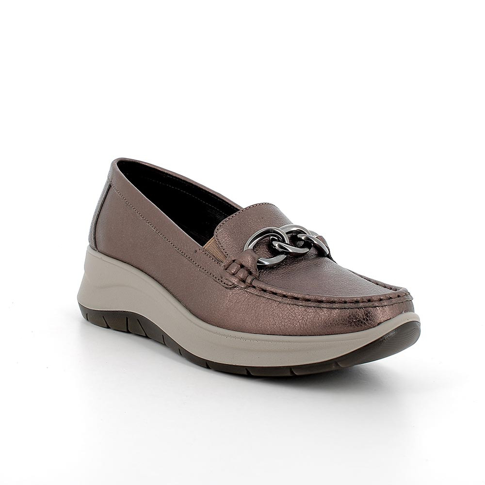 Mocassini in pelle con leggera zeppa per una calzata molto comoda. Morsetto ornamentale ed elastici per facilitare la calzata. Fodera e sottopiede in pelle per massima igiene