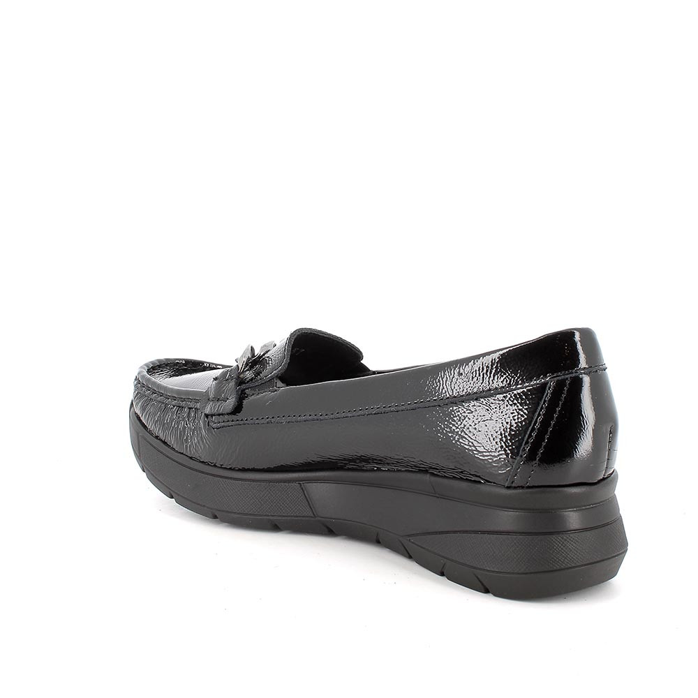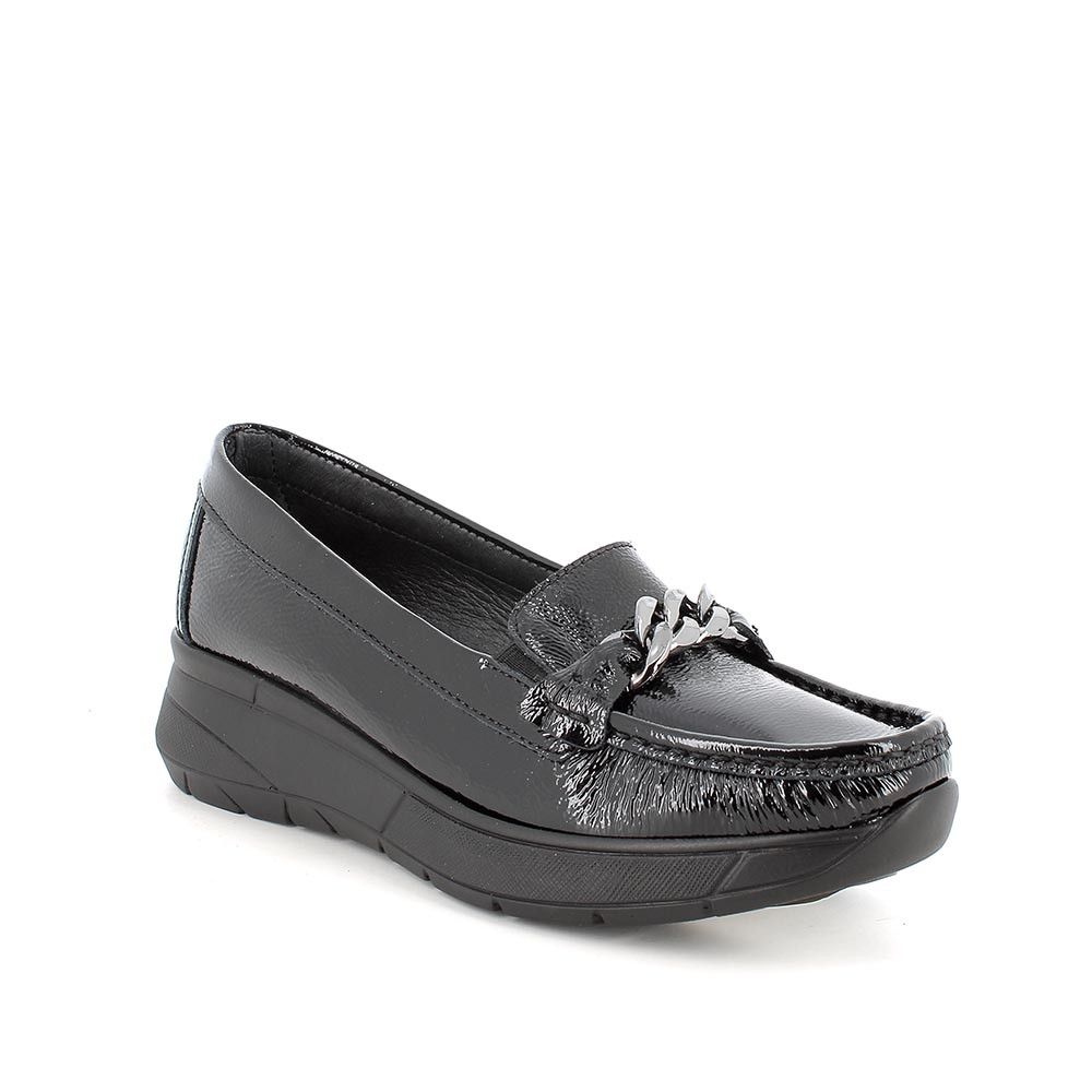 Mocassini in pelle con leggera zeppa per una calzata molto comoda. Morsetto ornamentale ed elastici per facilitare la calzata. Fodera e sottopiede in pelle per massima igiene